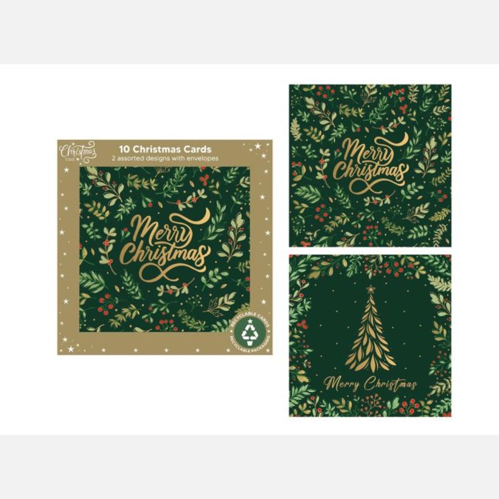 This pack of ten cards is a great addition to any Christmas collecton, made from high quality card featuring two green foliage and tree designs with a gold foil finish, the pack includes ten white envelopes.