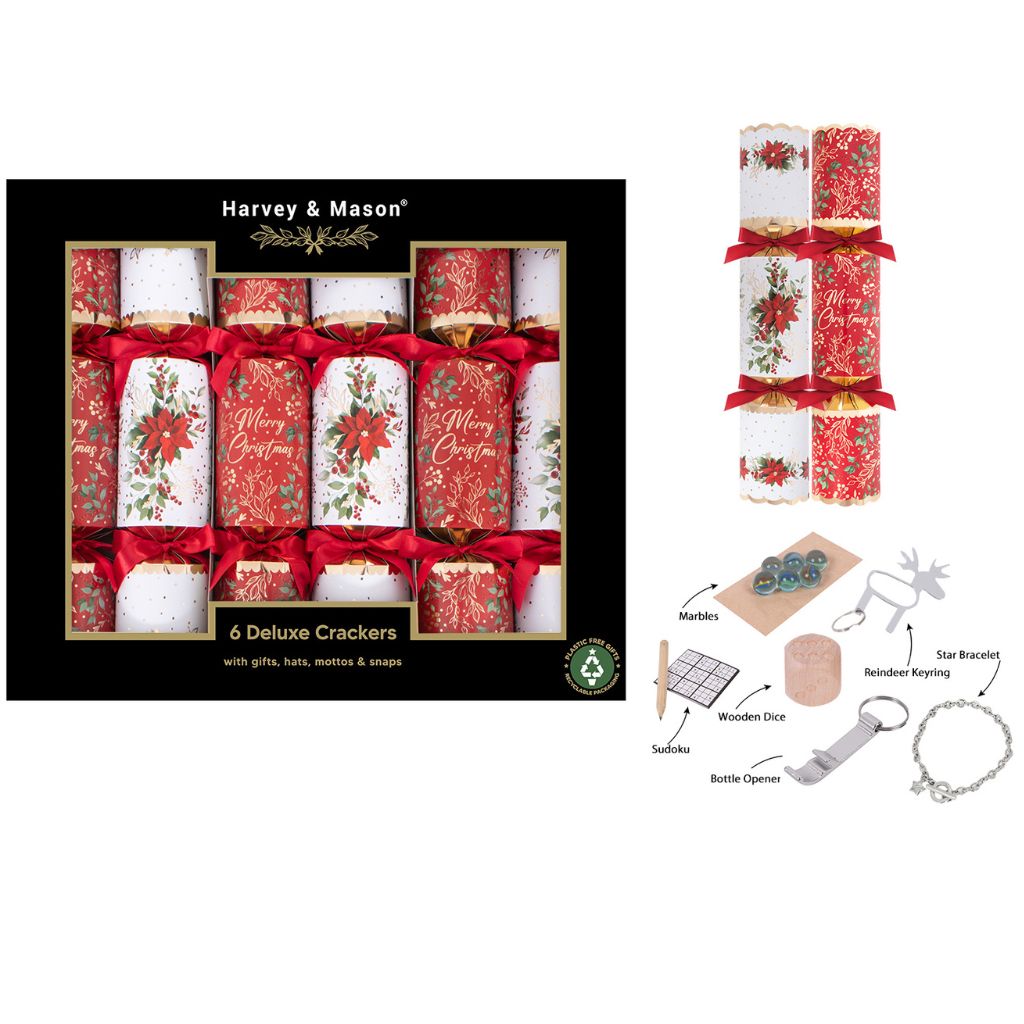 This box of six deluxe crackers is a traditional choice that will sit perfectly in a festive Christmas display, featuring a poinsettia design on a red or white base, shiny gold hotstamp and finished with red satin ribbon. Cracker contents include a hat, joke, snap and a special prize of a bracelet, su-doku puzzle, marbles, bottle opener, dice or key ring.