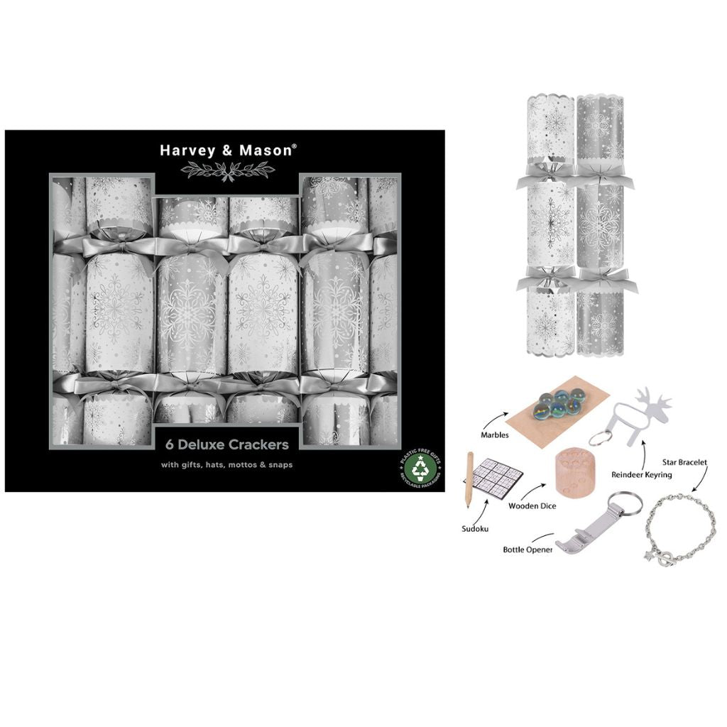This box of six deluxe crackers is a traditional choice that will sit perfectly in a festive Christmas display, featuring a silver snowflake design on a silver or white base, shiny silver hotstamp and finished with silver satin ribbon. Cracker contents include a hat, joke, snap and a special prize of a bracelet, su-doku puzzle, marbles, bottle opener, dice or key ring.