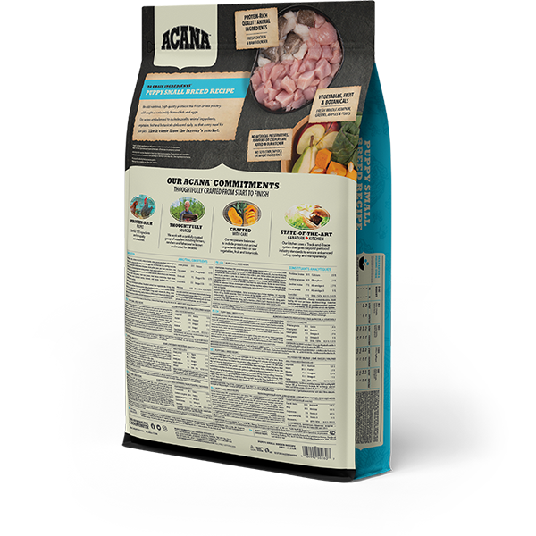 Your small-breed puppy is growing fast, requiring a diet that is rich in protein and fat from fresh, whole animal ingredients to support proper development. Brimming with meat, organs, cartilage, and bone from free-run chicken and wild-caught flounder, plus nourishing cage-free eggs delivered fresh or raw to our kitchen by people we know and trust, ACANA Puppy Small Breed has everything your growing puppy needs for optimal growth and development.
