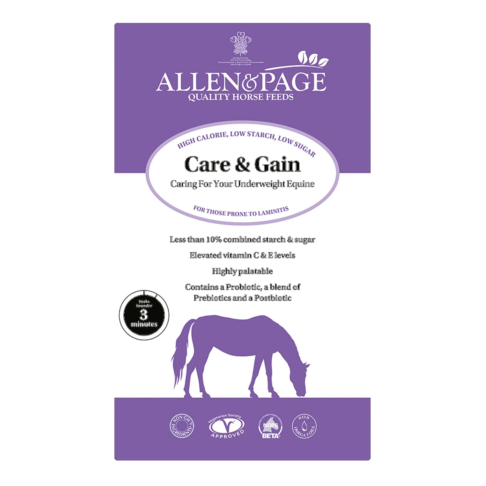 Care & Gain is a high calorie feed suitable for those prone to laminitis. Care & Gain is ideal for poor doers who need to gain weight or those requiring higher energy levels, whilst keeping starch and sugar levels low.