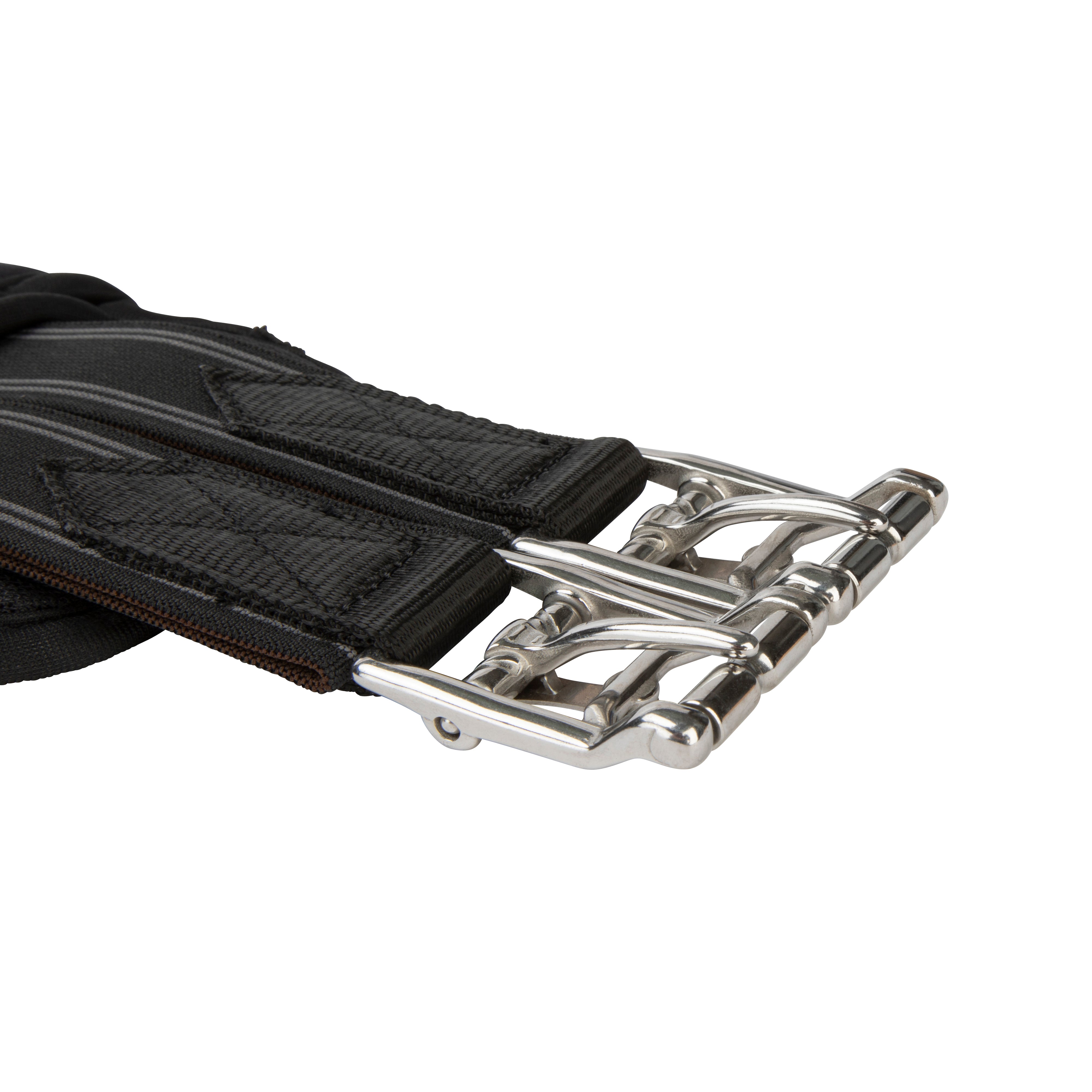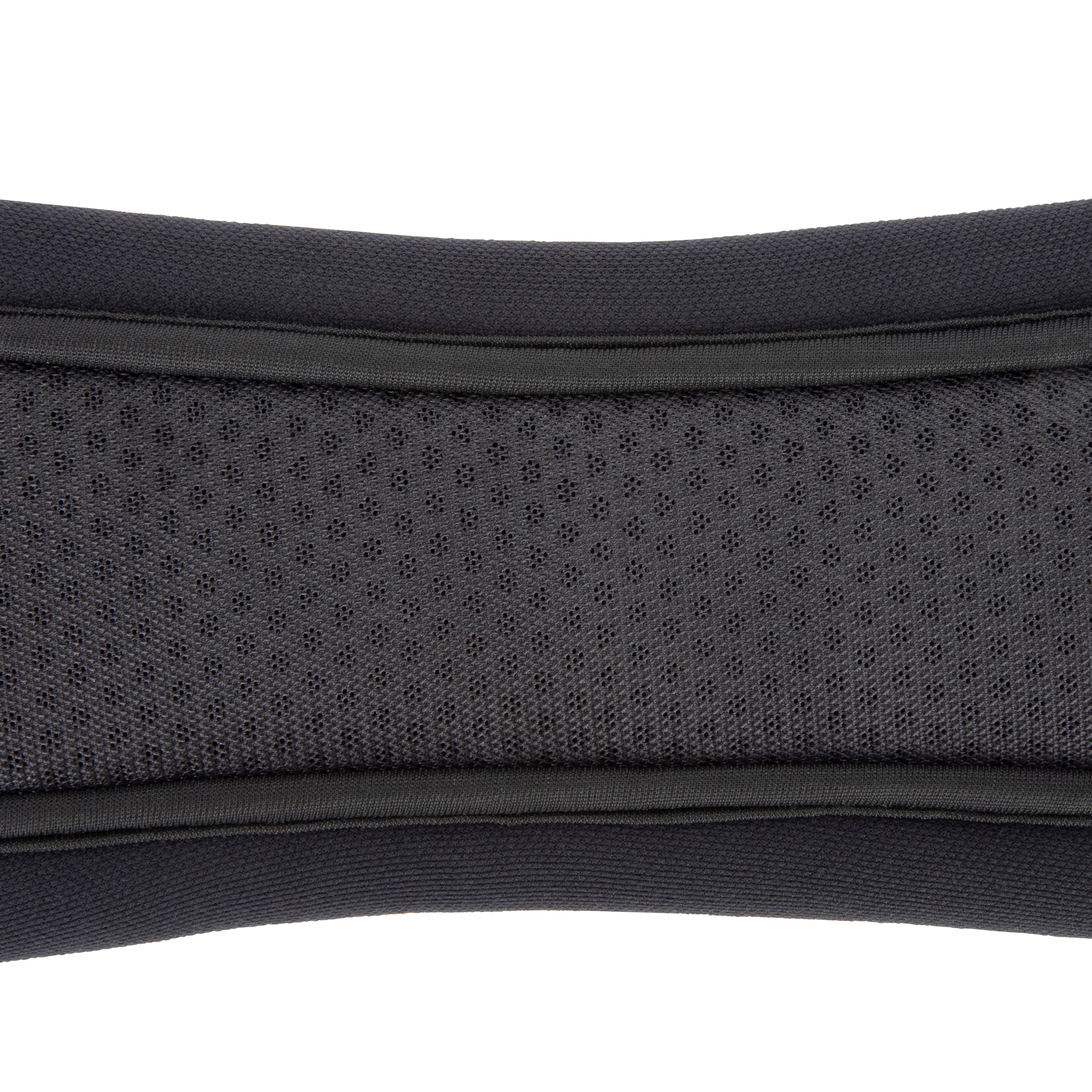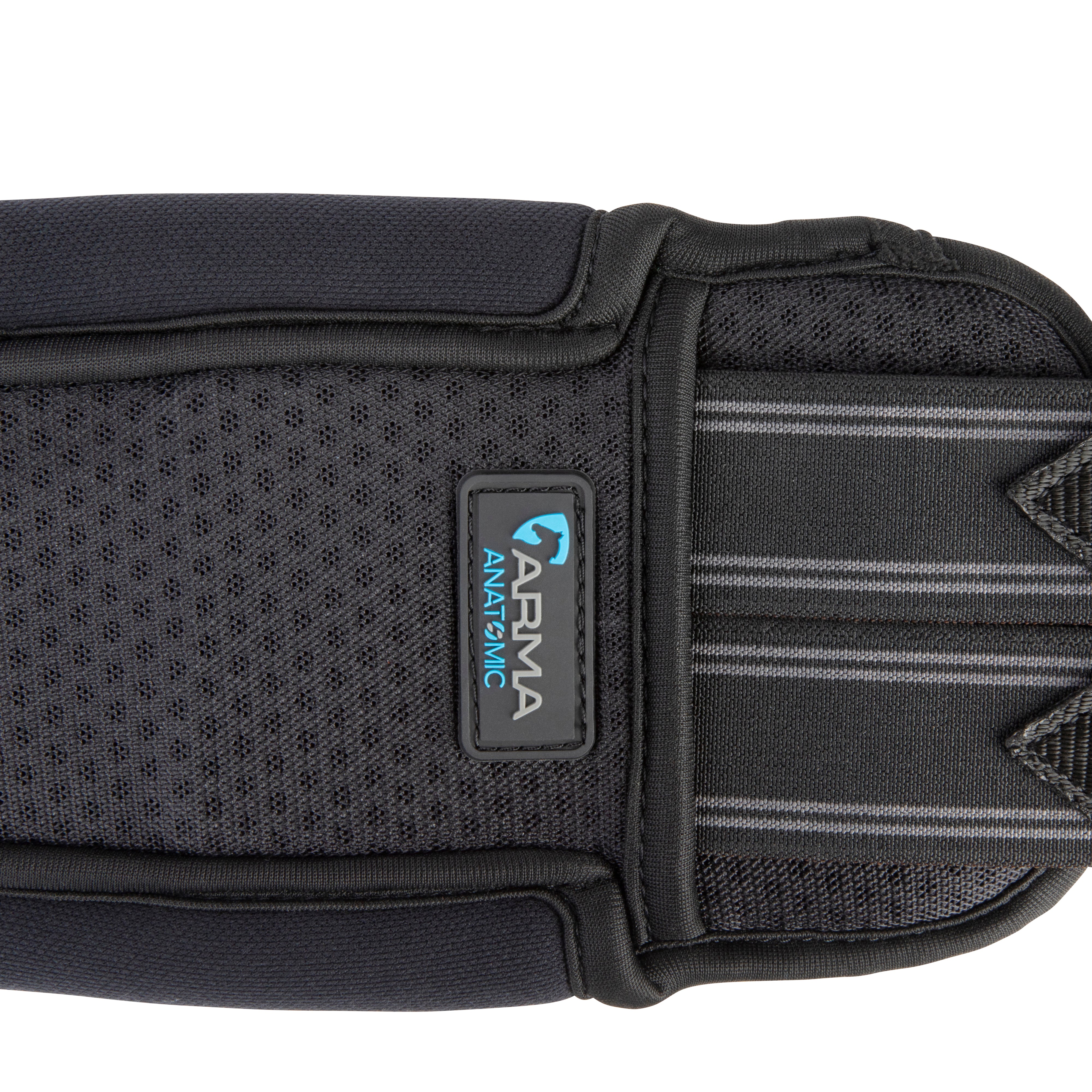 The ARMA Performance anatomic girth is designed in carefully engineered fabrics to promote dryness and enhance comfort for the horse. Built around a non-stretch nylon web core for strength, a heat responsive memory foam lining moulds to the body's contours for a bespoke fit. Soft roll-away edges remove the risk of pinching and create a cushion effect. The outer girth features a 3D aerated surface to help bring air movement through to the underlayers, reducing moisture and heat build up. Anatomic contour shaping enables ergonomic pressure dispersal and greater allows greater freedom of movement behind the elbows. Double layer pressure alleviating elastic inserts at both ends with curved self-closing loop bar roller buckles at one end, standard roller buckles at the other. A centre D-ring for martingale and breastplate attachment. Stainless steel fittings for long lasting performance.