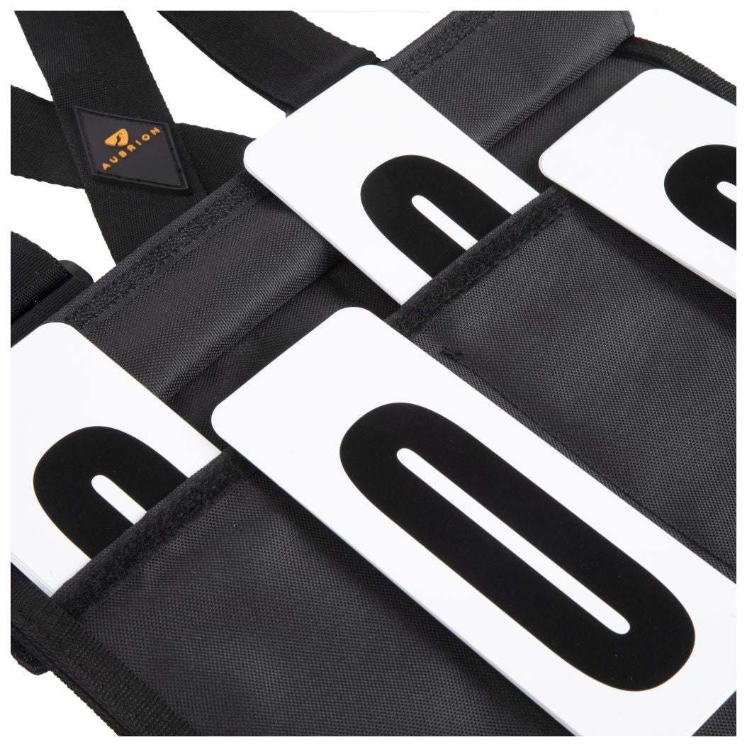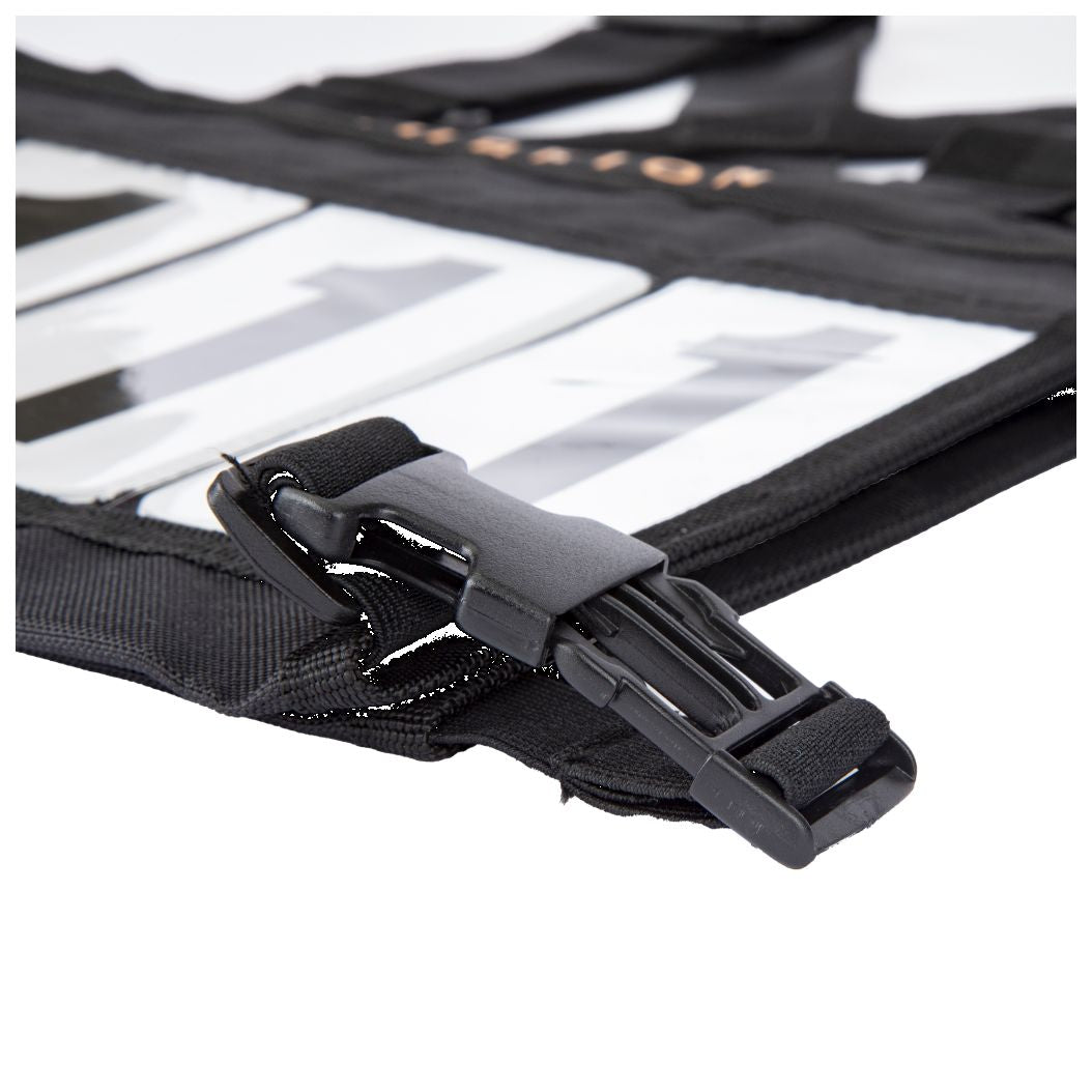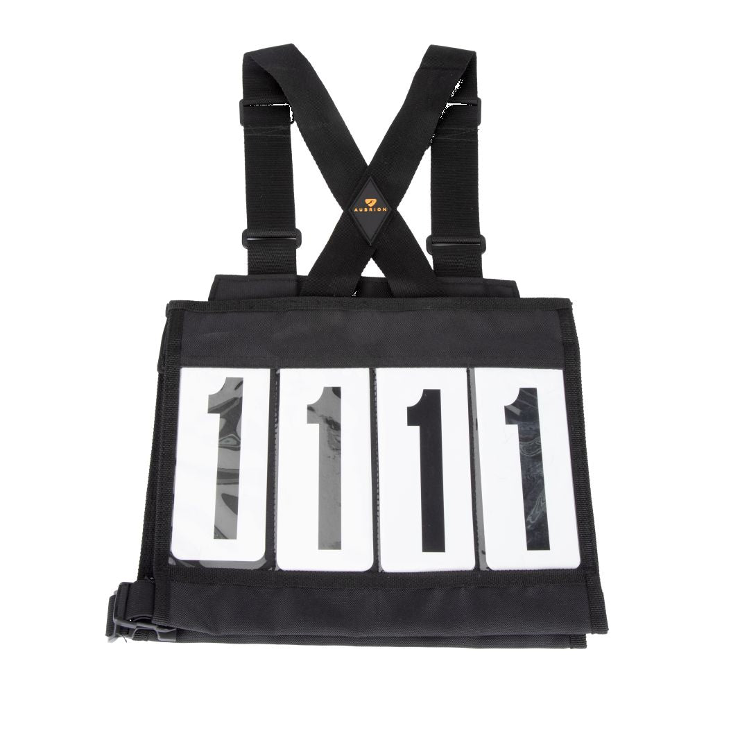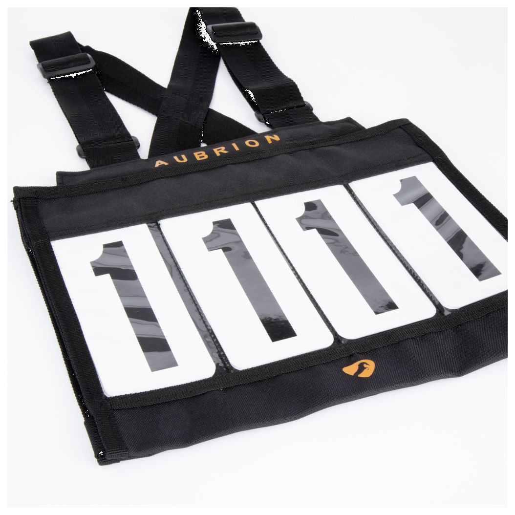 The fully adjustable Aubrion number bib set ensures you have all you need to be competition number-ready. The bib features a 4 digit number display in wipe-clean transparent plastic holders at the rider's front and back. Robust number cards are inserted at the reverse of the display via touch close flaps. Adjustable shoulder straps allow a snug and secure fit. At the waist are elastic straps, one with a slider and a quick-release buckle for easy entry and securing. Aubrion prints to the front and back.