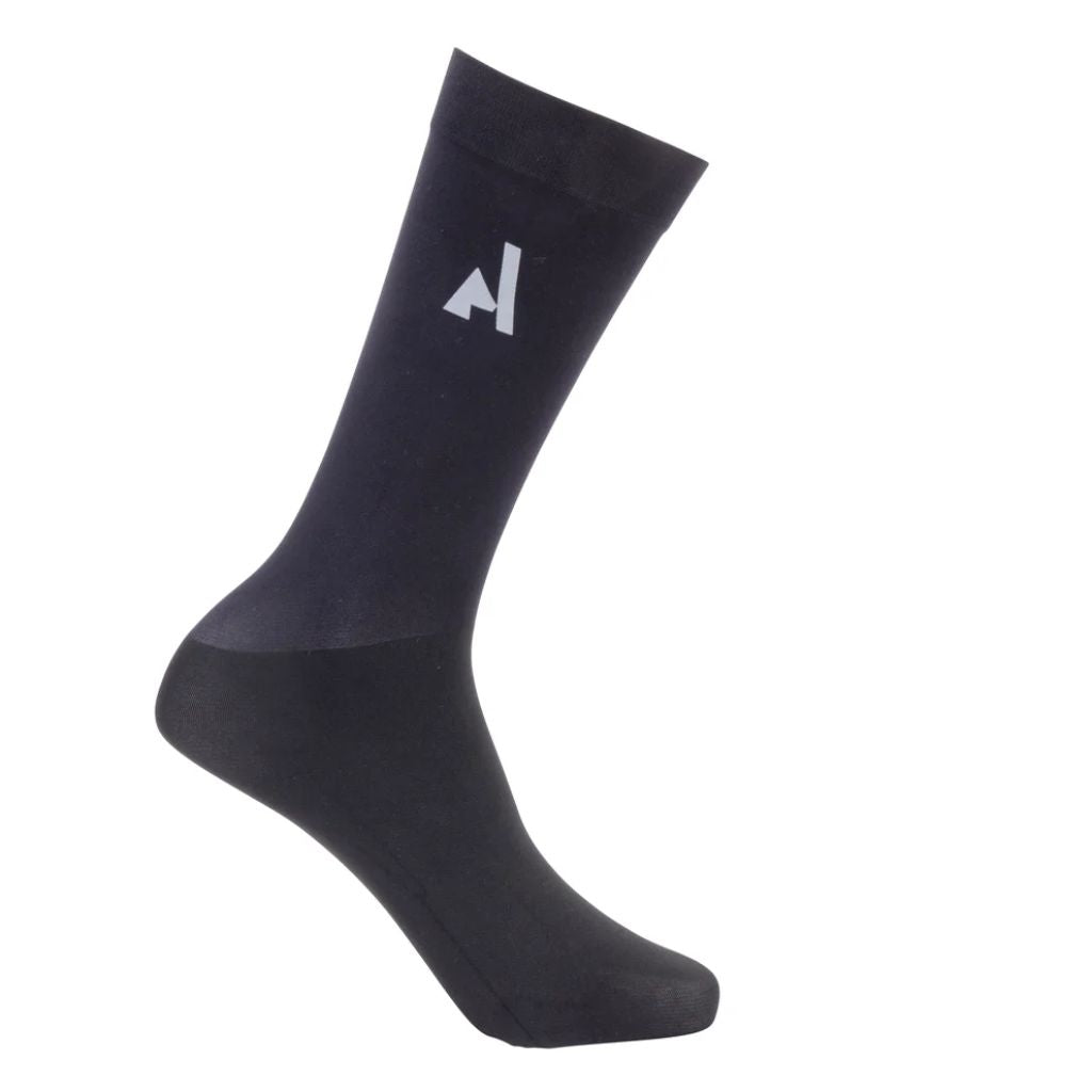 Heat releasing stretch knit gives the Aubrion React Performance Socks bring a light feel under long riding boots. Silicone grips assist with keeping the socks elevated. Further detail: knee length, sleek and smooth, quick dry, breathable, silicone boot grips, Aubrion React logos. One size (10.5 - 3.5).
