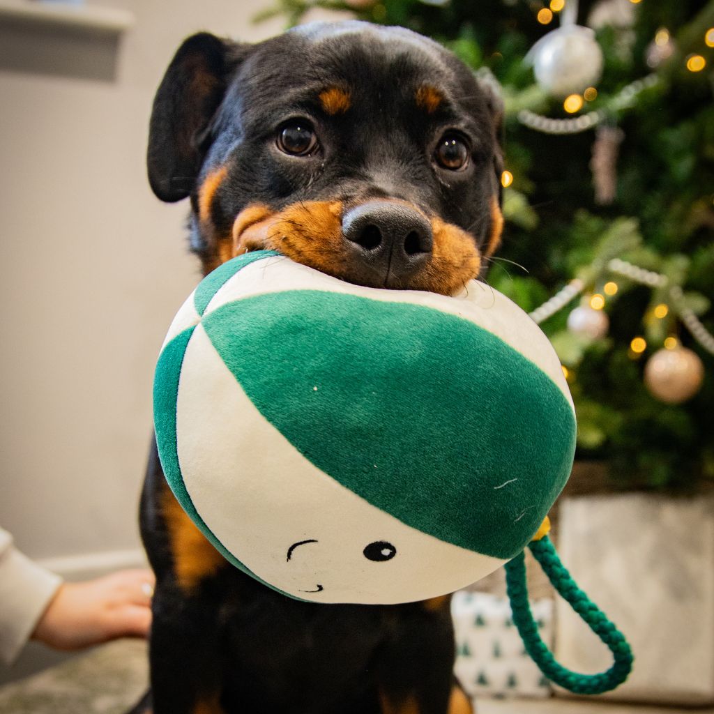 Meet Blitzen Bauble, the extra-large giggling dog toy designed for endless festive fun! This oversized bauble is made from extra soft, squishy material, perfect for both gentle chewers and playful pups. Featuring a cute winking face, Blitzen brings charm and personality to playtime. Equipped with a durable rope handle, it’s easy to toss, tug, and carry for interactive fun. Plus, the giggling sound adds extra excitement, making it the perfect holiday toy to keep your dog entertained all season long!