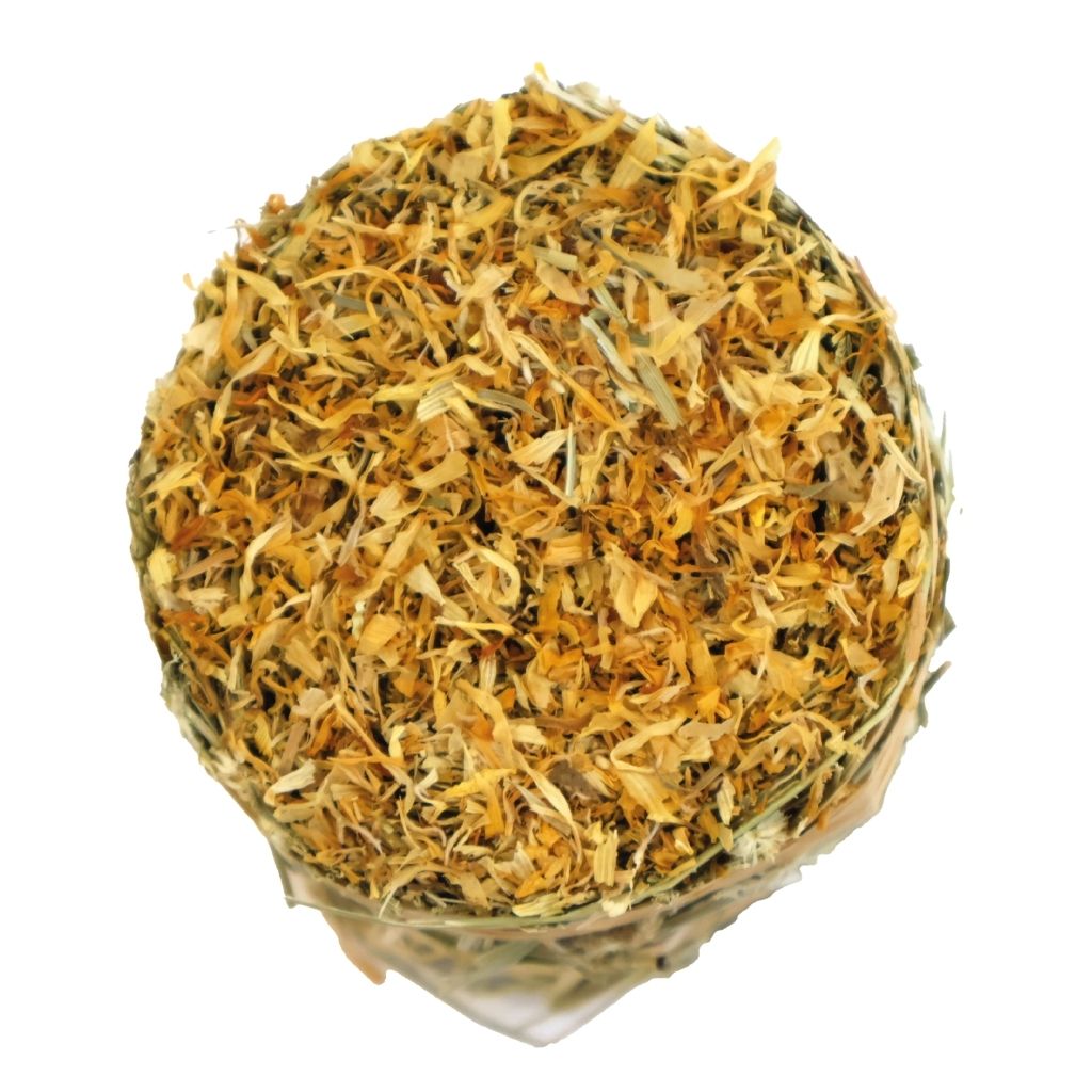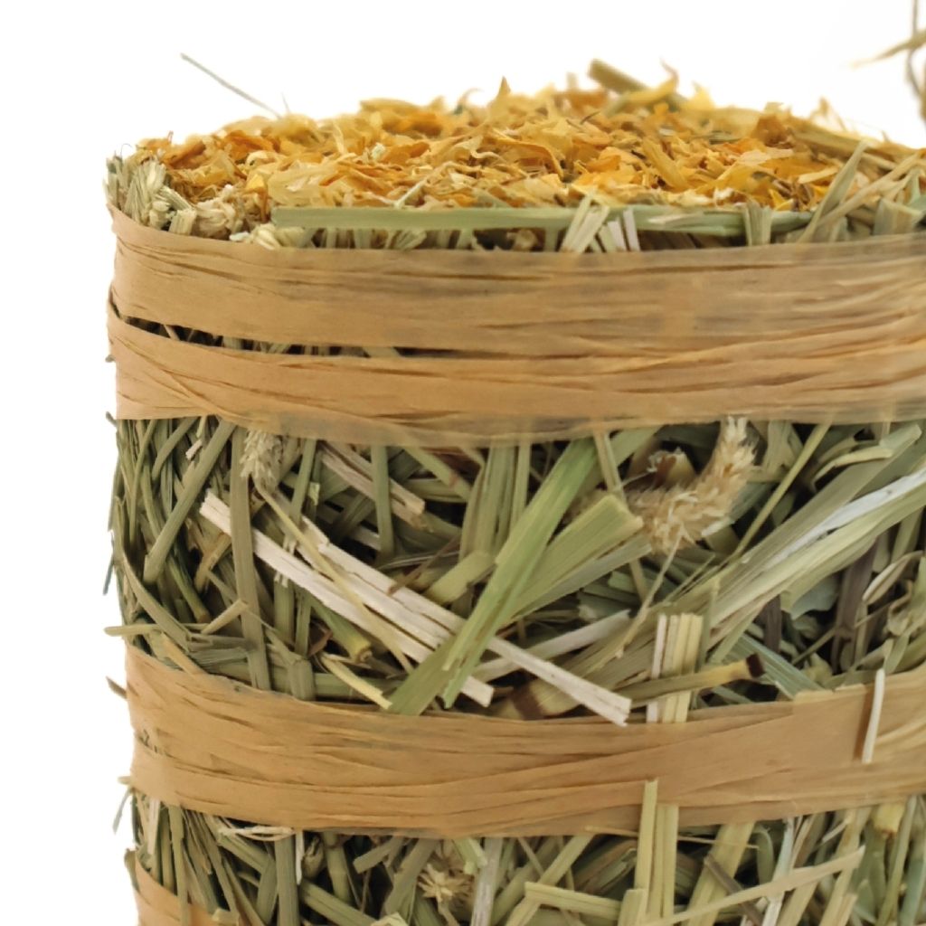 Excel Forage & Feast Mini Bales are the perfect complementary, healthy treats for your rabbits, guinea pigs, or chinchillas. Rabbits and guineas need plenty of fibre to maintain healthy digestion, enjoying a munch on fibre-filled treats also helps keep their teeth in good shape. Yummy, healthy treats add enrichment to your pets’ day and are great for training and hand feeding, helping you to build your bond with your buns and guinea pigs. Topped with tasty marigold, it’s made with natural ingredients and is great for encouraging natural instincts like foraging too.
