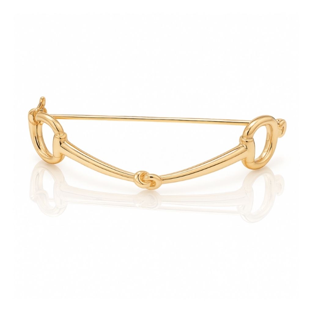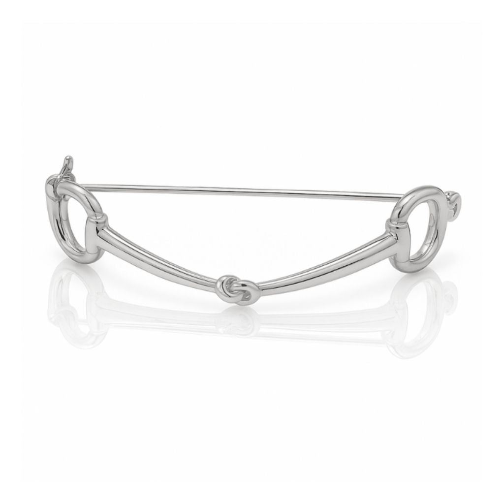 Curved snaffle bit design with safety clasp to back. Perfect for ties and stocks. PU leather pouch included.