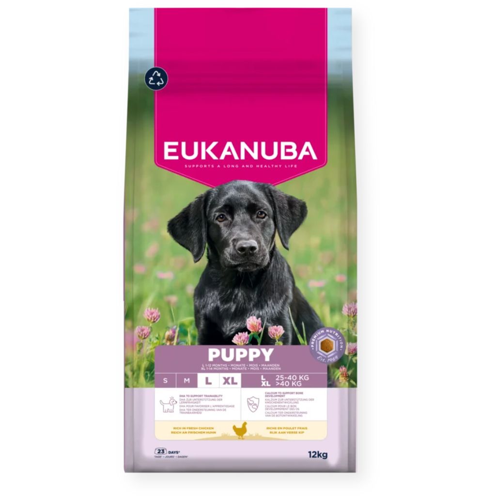 EUKANUBA Life Care offers science-backed premium nutrition, designed to meet the changing needs of dogs through every stage of life. Specially formulated for large-breed puppies aged 1 to 12 months (or 1 to 14 months for giant breeds), this 100% complete and balanced dry food is rich in fresh chicken and features carefully selected ingredients to provide tailored nutrition for optimal growth and development. Containing DHA, this recipe supports learning and trainability during your puppy's early stages, while calcium is favourable for developing strong bones and a healthy skeletal structure. The antioxidant blend with vitamin E helps support immunity, ensuring your puppy's natural defenses stay strong. The tailored fibre blend of prebiotic FOS, MOS, and beet pulp promotes healthy digestion, while natural sources of omega-6 and omega-3 support healthy skin and a shiny coat. This dry food provides advanced nutrition for large-breed puppies, supporting optimal body condition and lifelong wellbeing. Trust EUKANUBA to nurture your dog's foundation for a happy and healthy life