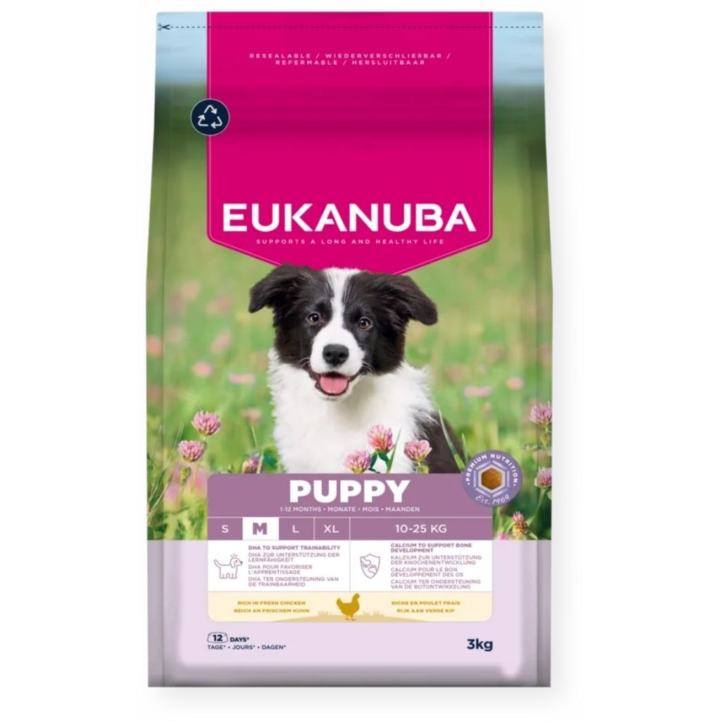 EUKANUBA Life Care offers science-backed premium nutrition, designed to meet the changing needs of dogs through every stage of life. Specially formulated for medium-breed puppies aged 1 to 12 months, this 100 % complete and balanced dry food is rich in fresh chicken and features carefully selected ingredients to provide tailored nutrition for optimal growth and development. Containing DHA, this recipe supports learning and trainability during your puppy's early stages, while calcium is favourable for developing strong bones and a healthy skeletal structure. The tailored fibre blend of prebiotic FOS, MOS, and beet pulp promotes healthy digestion, while natural sources of omega-6 and omega-3 support healthy skin and a shiny coat. EUKANUBA's unique hexagonal kibbles, combined with the DentaDefense dental care system, work to maintain clean and healthy teeth over the long term. This dry food provides advanced nutrition for medium-breed puppies, supporting optimal body condition and lifelong wellbeing. Trust EUKANUBA to nurture your puppy's foundation for a happy and healthy life.