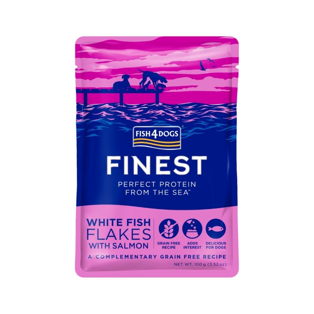 Fish4Dogs Finest White Fish Flakes with Salmon is a complementary wet food, made with a combination of two delicious tasting fish served in a nutritious fish broth.