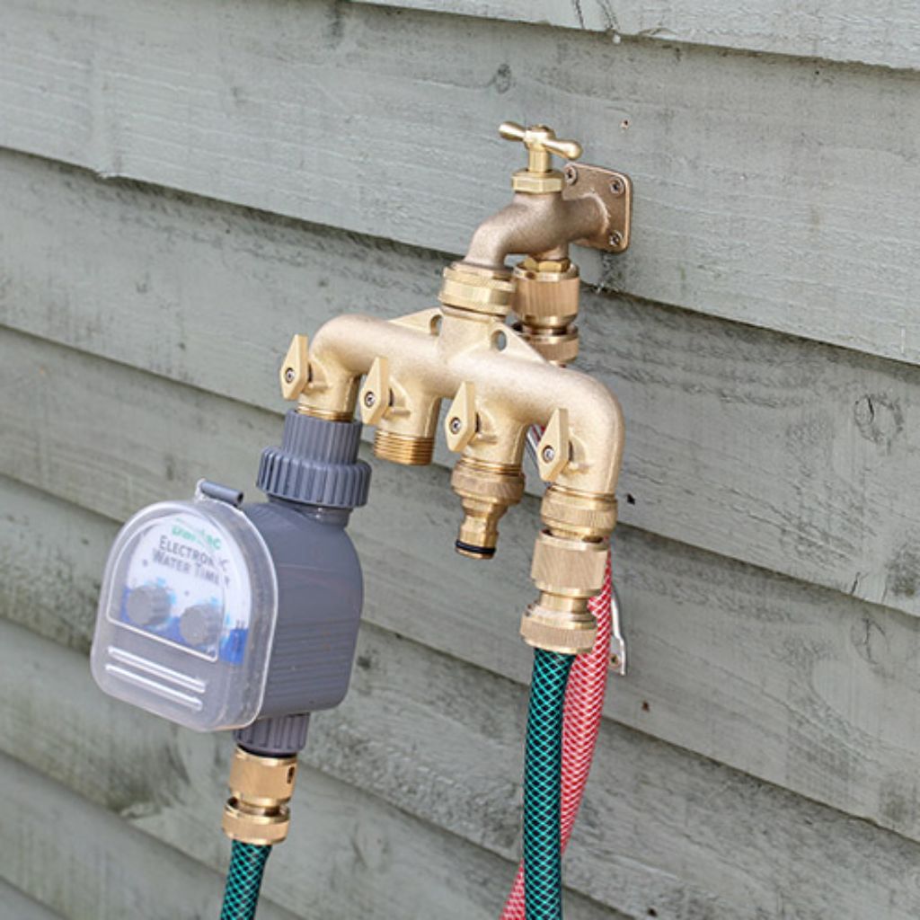 The Darlac 4 Way Brass Manifold fits directly onto an outside tap to provide four water outlets for all your watering needs. Take your garden watering set-up a step further and automate your watering with the addition of the Darlac Electronic Water Timer, which will screw directly onto the garden tap manifold. Keep a short length of hose permanently attached to one of the other outlets to fill watering cans and buckets, and then leave the remaining outlets free for longer hoses.