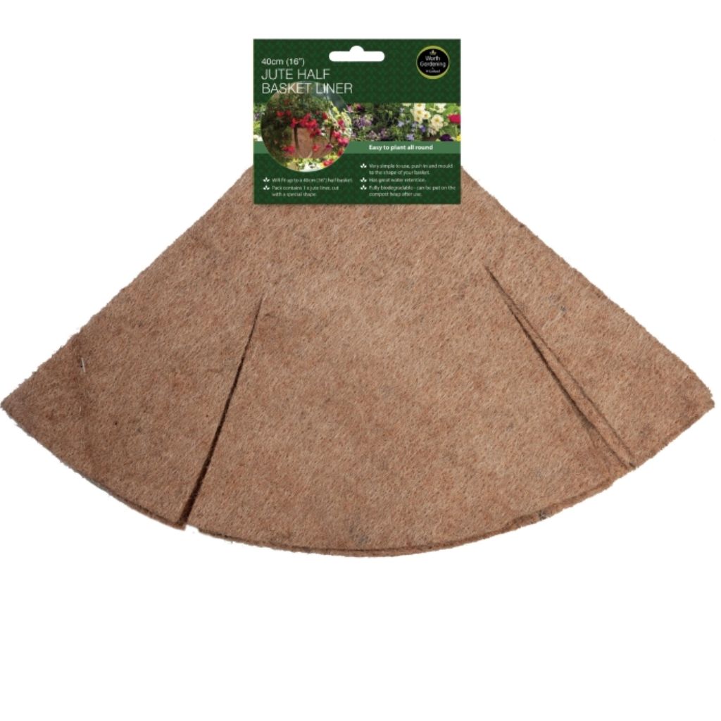 Will fit up to a 40cm (16") half basket. Pack contains 1 x jute liner, cut with a petal shape. Simply push in and mould to the shape of your basket and overlap the petals, partly fill with compost mixing in a slow release fertiliser (optional). Then trim off the excess material around the top of the basket with a pair of scissors and fill to the top with more compost. Easy to plant around the sides using scissors to cut holes as required. Very simple to use, the jute liner has more water retention than other basket liners and will not attract birds like moss and wool liners. Fully biodegradable, can be put on the compost heap after use.