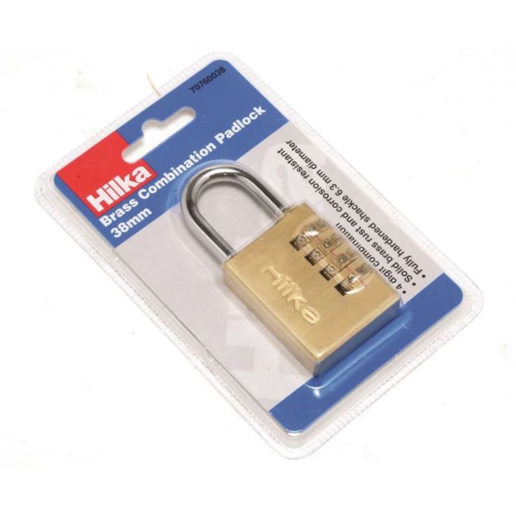 38mm Brass combination padlock, 4 digit combination, solid brass rust and corrosion resistant, fully hardened shackle 6.3mm diameter. Display packaged in double blister card.