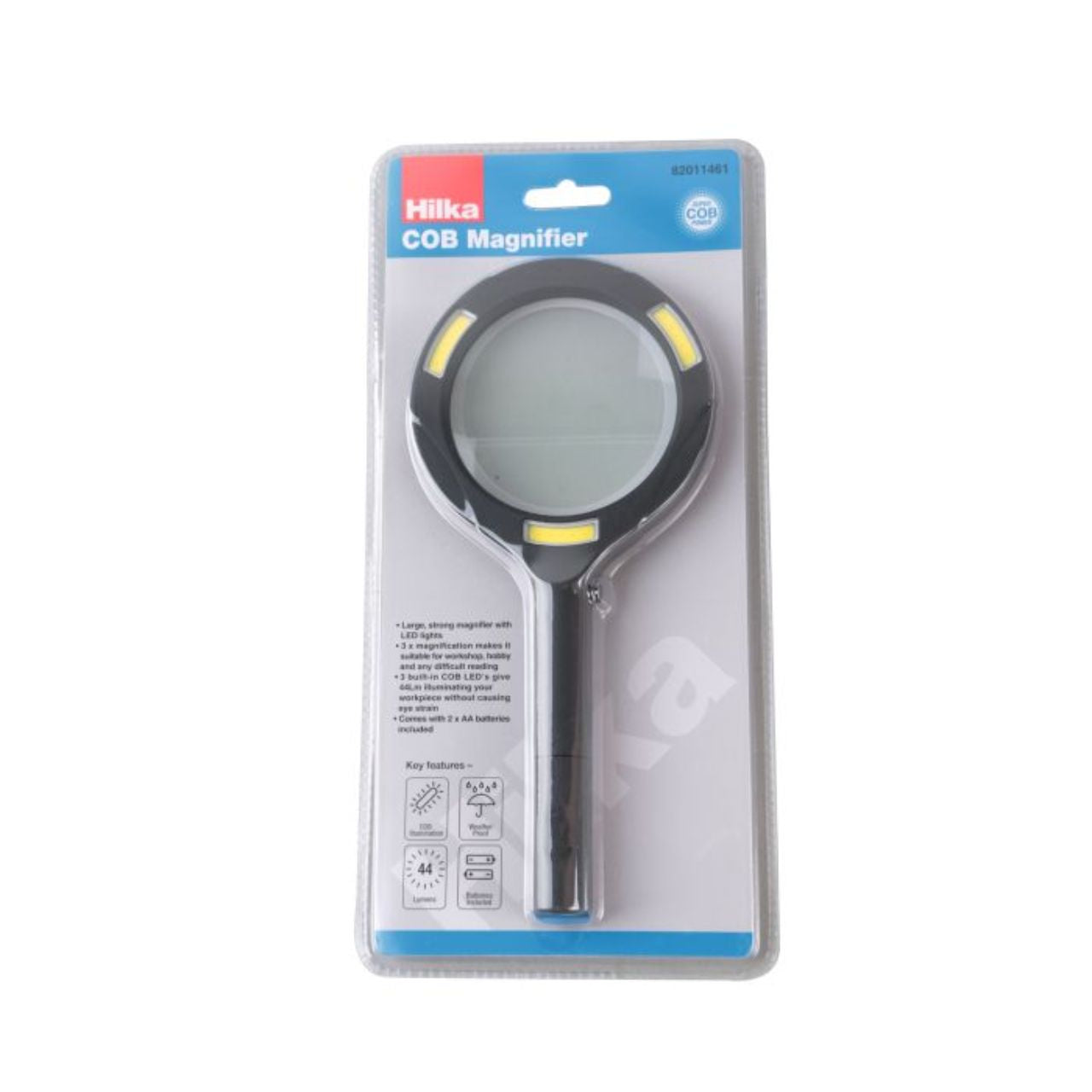 Large, strong magnifier with LED lights. 3 x magnification makes it suitable for workshop, hobby and any difficult reading. 3 built-in COB LED's give 44Lm illuminating your workpiece without causing eye strain. Comes with 2 x AA batteries included.