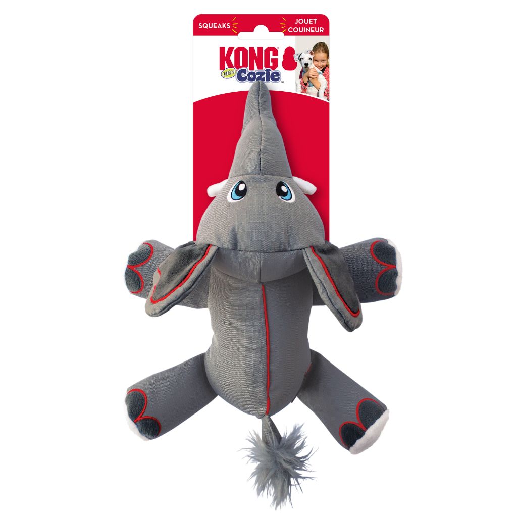 The KONG Cozie Ultra Elephant uses KONG Ultra-Tex fabric construction, which combines ultra-durable technology that uniquely supports action-packed fun. The ripstop material and reinforced seams are supported with a robust interior liner and is designed to fulfill a dog’s natural hunting and chewing instincts. Multiple reinforcements, including five times more stitching, add strength and durability ensuring that long-lasting fun is supported. Add to that internal squeakers and dense levels of stuffing and this toy is sure to keep playtime going and going and going.