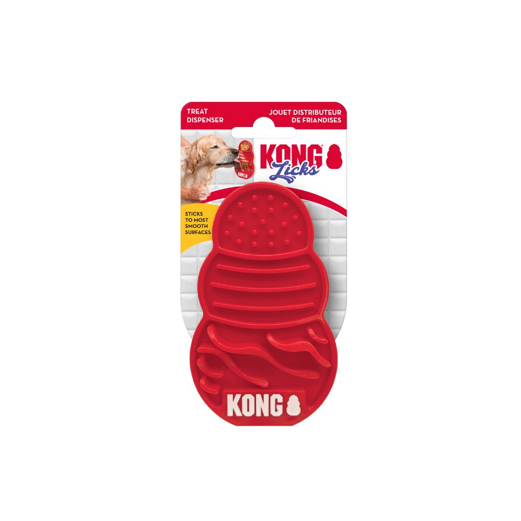 KONG Licks ridges and grooves hold Easy Treat, peanut butter, kibble, etc. for long-lasting licking. Fights boredom and occupies distraction during exams, baths and nail trims. Plus, licking releases endorphins that help soothe dogs. Two suction cups stick to flat surfaces for a movable feast of fun. Different ridge shapes hold variety of food, keeps pups interested and helps clean tongue and teeth.