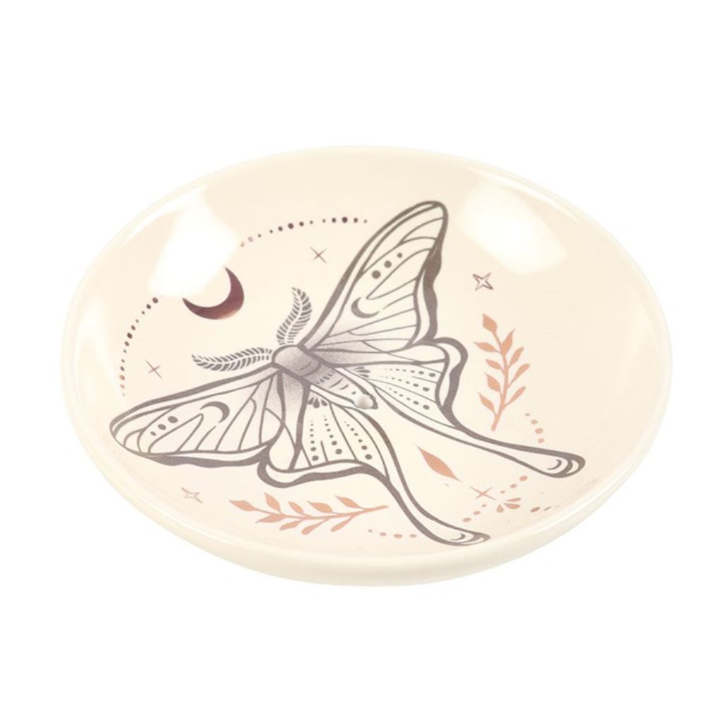 Perfect for adding an ethereal touch to any space, this incense dish is adorned with an elegant luna moth design. The holder is thoughtfully designed to accommodate both incense sticks and cones, featuring a small hole in the centre for sticks and a flat stable surface for burning cones.