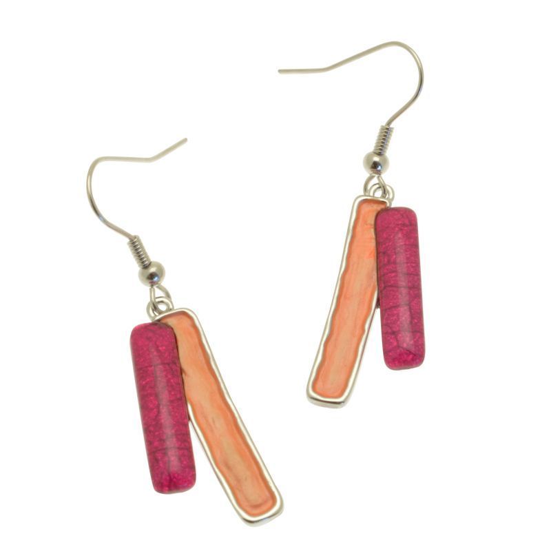 Featuring a strip of fuchsia pink marble resin alongside an orange painted piece, these attractive earrings have an effective two-tone appeal and a very smart colour combination. The earrings hang approx 2.8cm from fish hooks.
