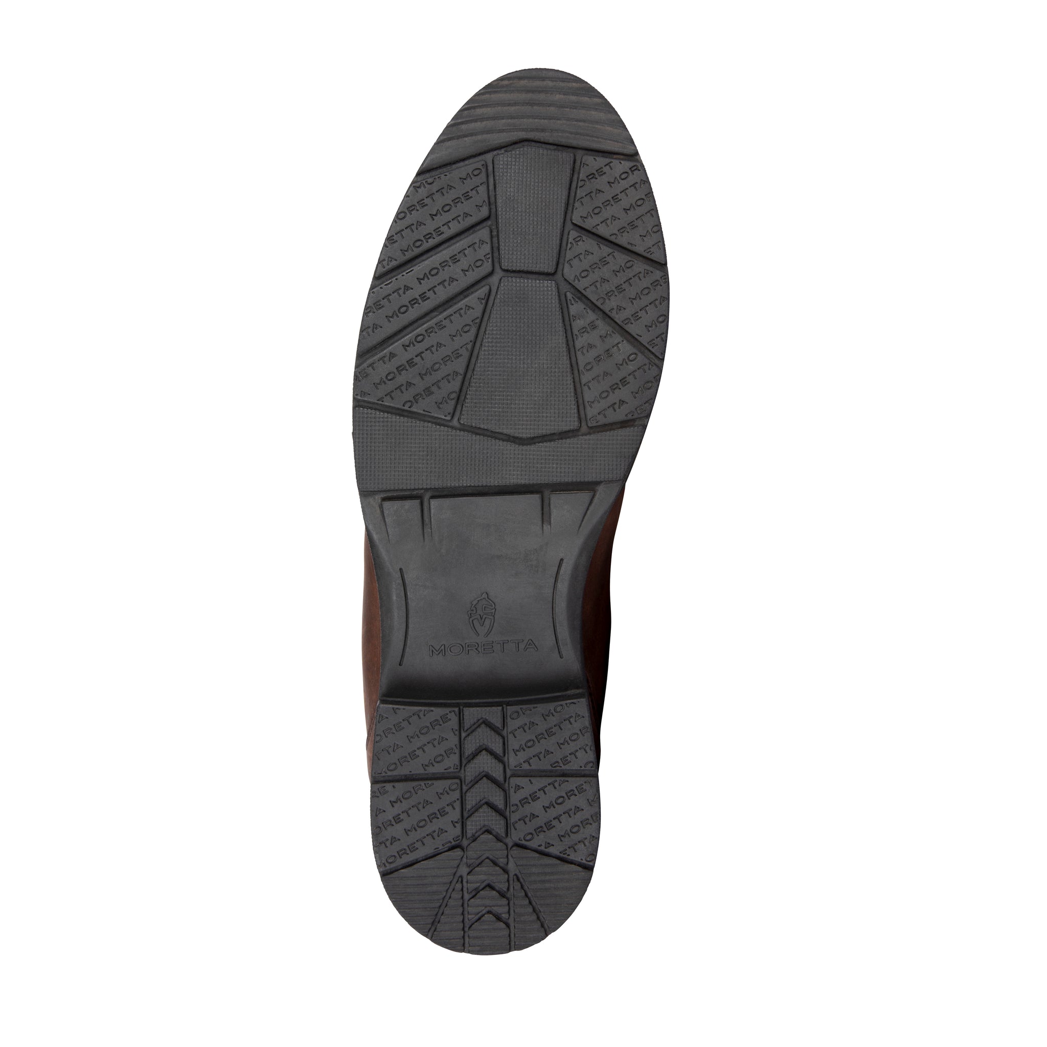 Designed for an affinity with all country pursuits, Varallo is equally at home in the great outdoors, in the saddle or about the yard. Waxed deep brown leather and contrasting suede dries quickly and remains flexible, a waterproof membrane prevents water penetration into the boot. A choice of calf width fittings and a stretch leg panel ensure a great fit. The sleek outer features an antiqued Moretta badge and an attractive tassel zip pull. Key features: FLEXDRY water resistant leather. Full leather lining. Waterproof membrane foot sock. UltraFit leg panel. YKK zip. ActiveFlex insole. Moretta AllTerrain outsole. Steel shanks. Stirrup compatible.