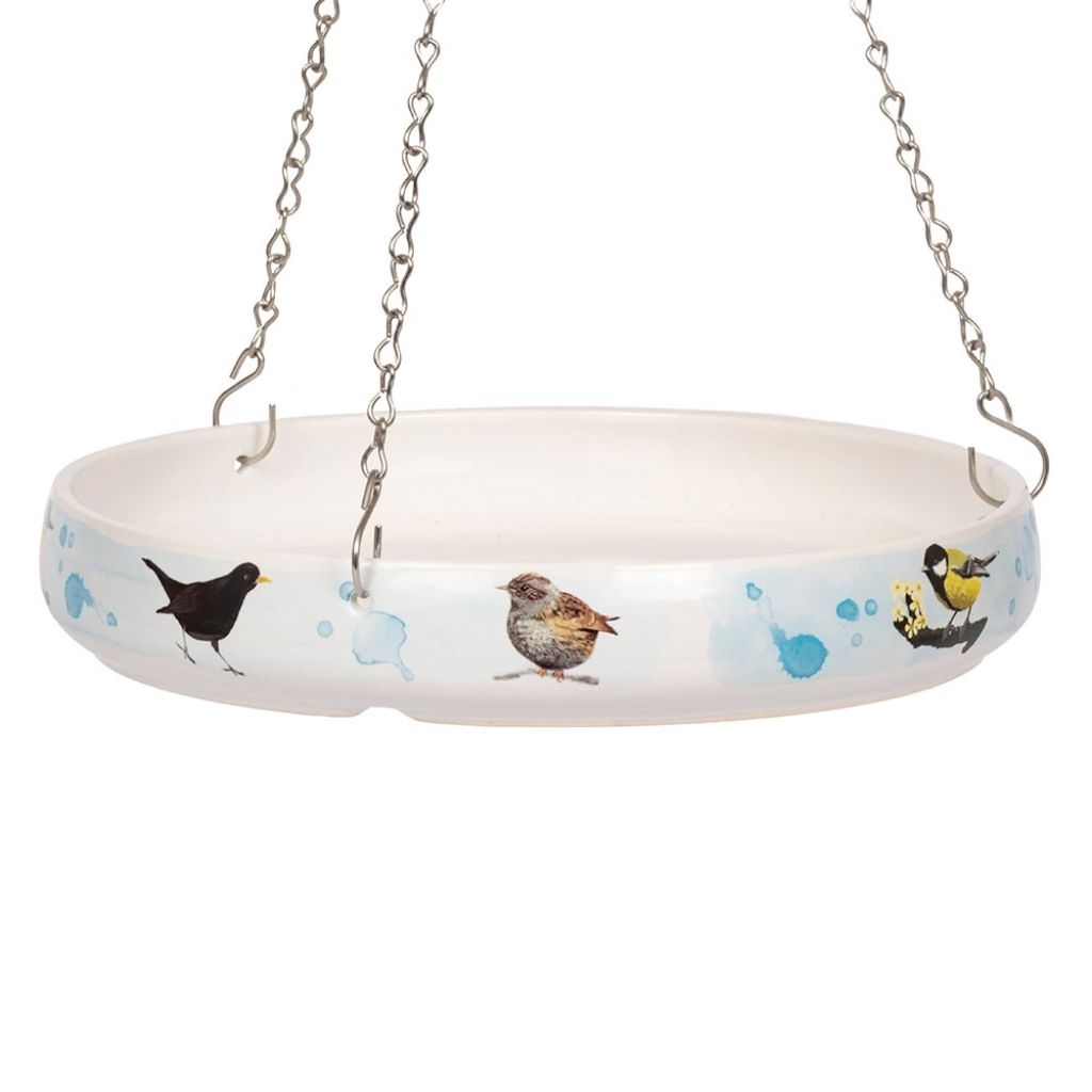 Give your feathered friends a beautiful and refreshing oasis with this gorgeous hanging ceramic bird bath, featuring intricate illustrations of common garden birds in Myrte’s unmistakable style. Suspended by a sturdy chain, it sways gently in the breeze, offering birds a safe and stylish spot to drink and bathe.