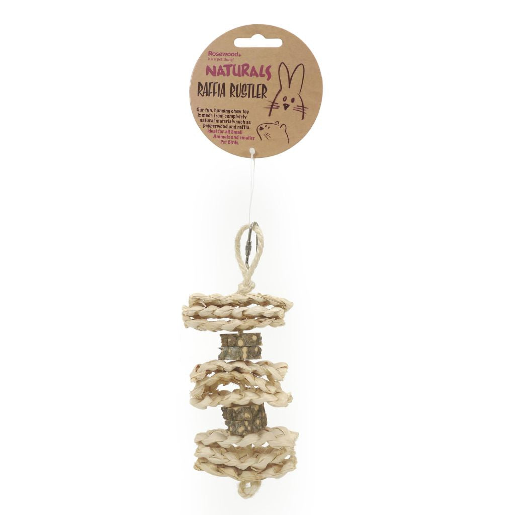 Our fun, hanging chew toy is made from completely natural materials such as pepperwood and raffia. Made without any glues or wire. It's approximately 20cm long and 7cm wide. Ideal for all Small Animals and smaller Pet Birds.