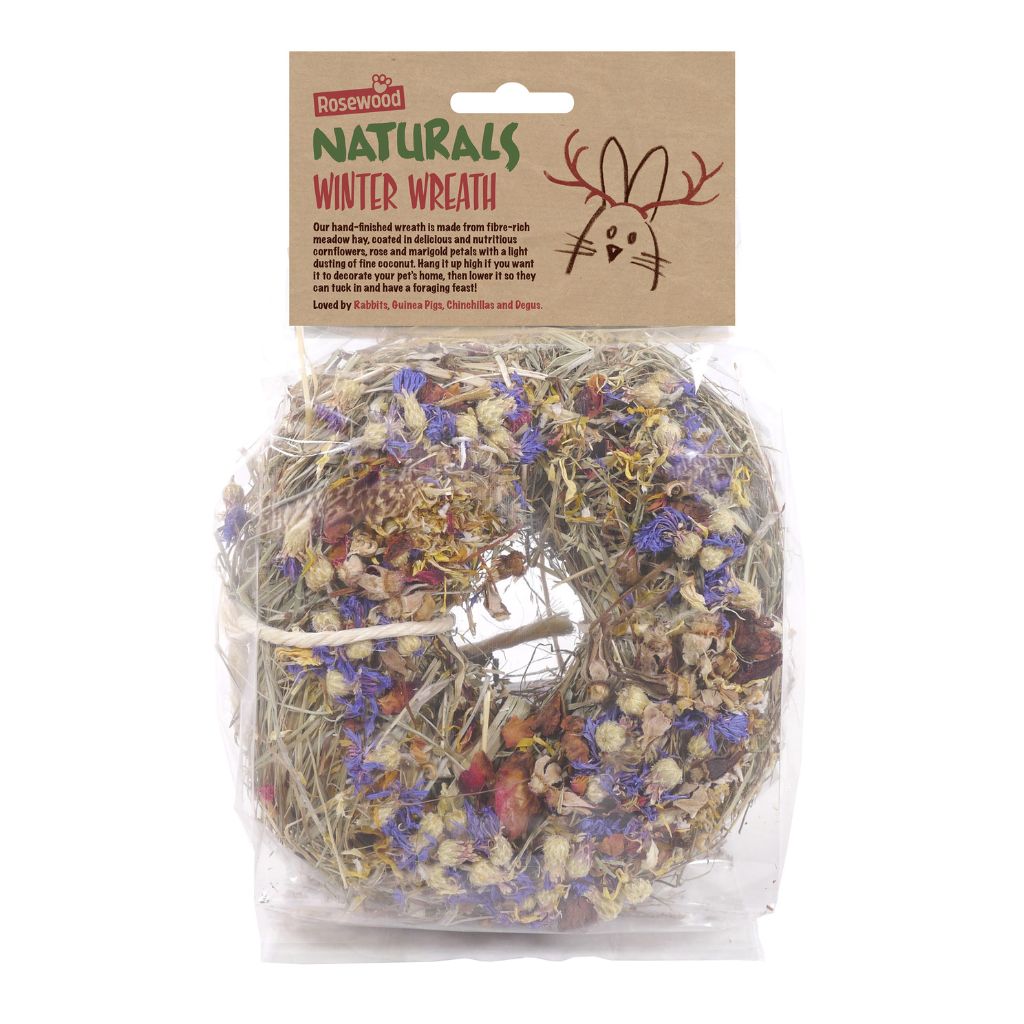 Our hand-finished wreath is made from fibre-rich meadow hay, coated in delicious and nutritious cornflowers, rose and marigold petals with a light dusting of fine coconut. Hang it up high if you want it to decorate your pet's home, then lower it so they can tuck in and have a foraging feast! Loved by rabbits, Guinea pigs, chinchillas and degus.