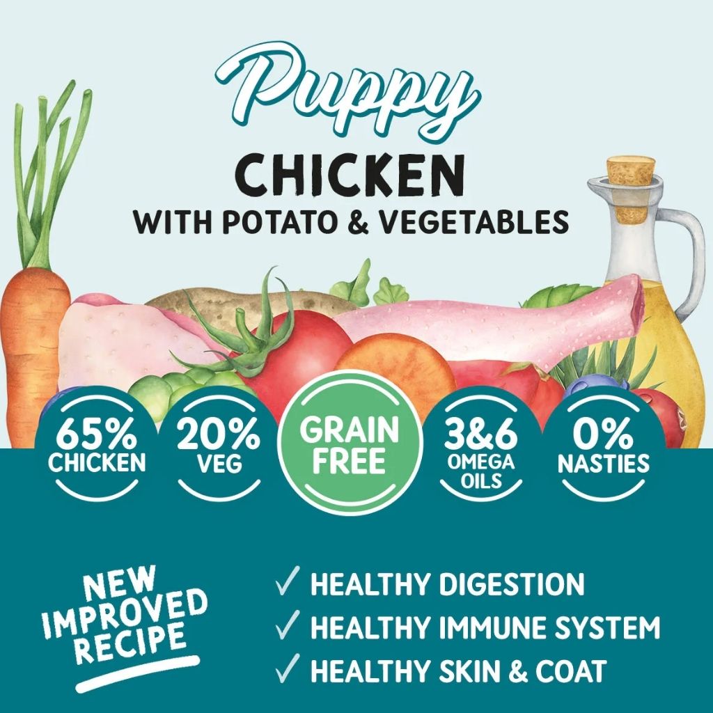 Our Wet Puppy Food is made for the new four-legged friend in your life! With 65% Chicken, this protein-packed meal is a rich source of protein for growing puppies. Chicken is an excellent source of quality protein, with B vitamins to support healthy muscles and energy delivery. This Grain Free Puppy Food with 20% potato allows for a more digestible product for your puppy's stomach.