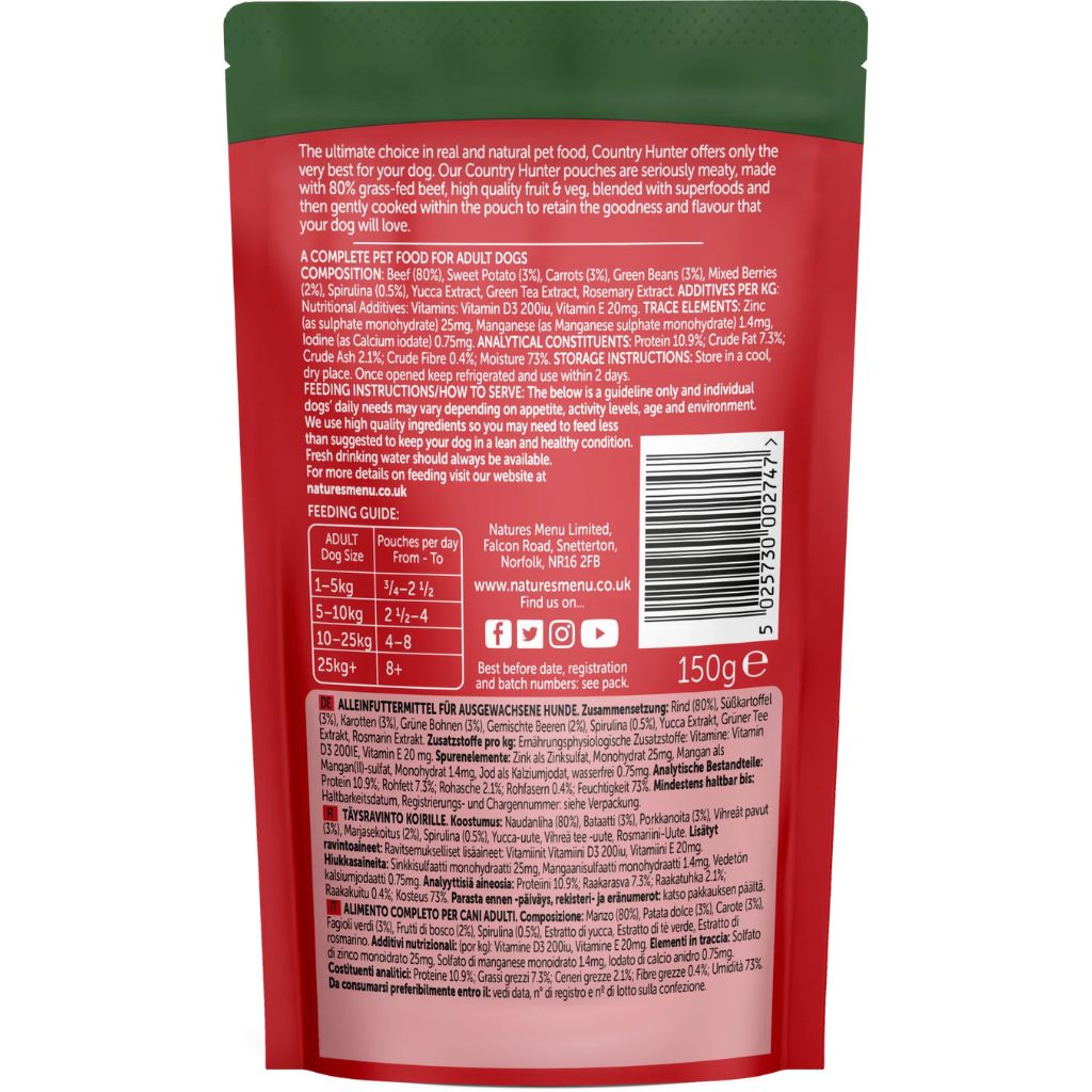 Super meaty wet food, made with 80% whole cuts grass-grazed beef blended with a nutritious selection of fruits and vegetables. Grain free, chicken free and low fat. Complete and balanced. Pack size: 6 x 150g