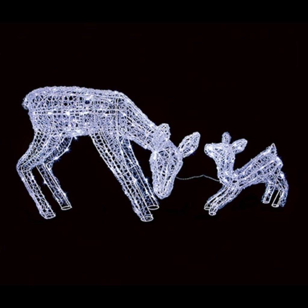 Charming 70cm and 38cm Soft Acrylic Doe and Baby Deer with 230 White LEDs and twinkling lights, perfect for adding gentle festive sparkle to your décor.