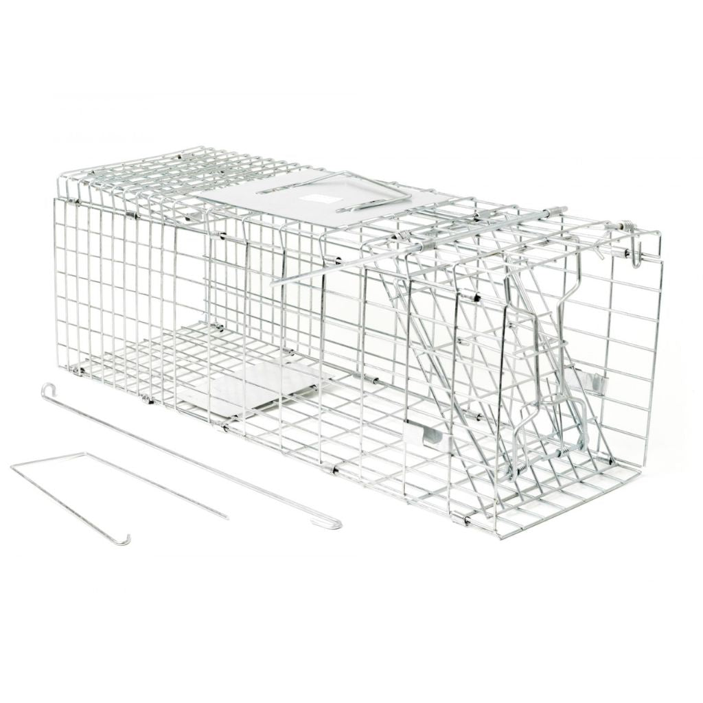 A traditional style cage trap for the humane trapping of rabbits, squirrels and similar sized pests. The entrance is quickly sprung closed when the intruder takes the bait, safely trapping it inside. Cage supplied flat packed to avoid taking up lots of space. Very easy to assemble and de-construct when not in use.