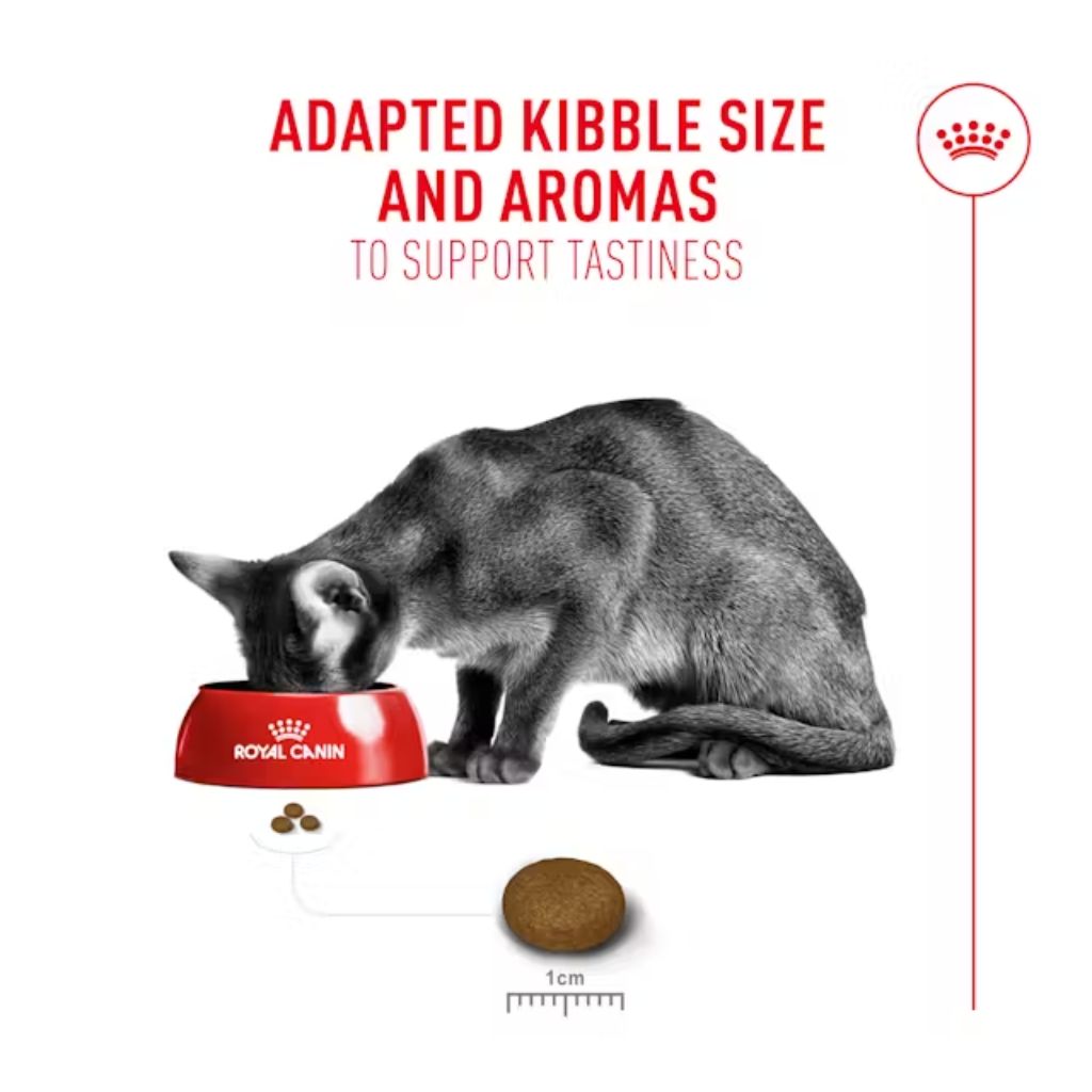 ROYAL CANIN® Fussy is our highly palatable range, specially designed for cats who say no to everything. Feeding picky eaters can be challenging, and our effective formula offers a simple solution. This tailor-made diet is nutritionally balanced and highly appetising, with a special combination of aromas and crunchy kibble texture. Energy-dense and rich in protein, ROYAL CANIN® Fussy is ideal for adult cats who are picky or only eat a small daily amount, as it helps them maintain a healthy weight. This latest nutrition features a high protein content of 40%, ensuring that fussy felines stay satisfied. It also supports urinary health and is suitable for sterilised cats. To improve palatability and mealtime for picky eaters, the Fussy formula combines our 3 former Exigent diets – Savour, Aroma, and Protein into one delicious product: ROYAL CANIN® Fussy.
