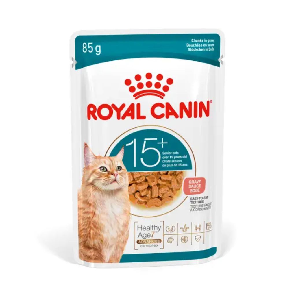 ROYAL CANIN® Ageing 15+ Chunks in Gravy is a wet food diet suitable for cats aged 15 and above. Designed for—and tested with—senior cats, ROYAL CANIN® Ageing 15+ Chunks in Gravy features an easy-to-eat texture to give your cat an enjoyable mealtime experience. This formula also contains increased palatants* for enhanced taste and smell. HealthyAge7™ Advanced Complex: This formula, featuring our HealthyAge7™ Advanced Complex, provides a precise nutritional blend designed to help maintain seven key dimensions of health and vitality in super-senior cats: Appetite and weight: Highly palatable and more energy-rich* to support a healthy appetite and help maintain an ideal weight. Digestion: Contains prebiotic fibres and highly digestible proteins to support healthy digestion. Mobility: Features more EPA & DHA* and chondroitin to support joint health and mobility. Skin and coat: The inclusion of linoleic acid, zinc and gamma-linolenic acid (GLA) help maintain skin and coat health. Kidneys: Contains high-quality protein and further adapted phosphorus levels* to support kidney health. Brain and vision: Includes tryptophan, EPA & DHA, taurine, and vitamin A to support cognitive function and vision. Immunity: Contains vitamins C & E, lutein, taurine, beta-carotene, and lycopene to help support the immune system.