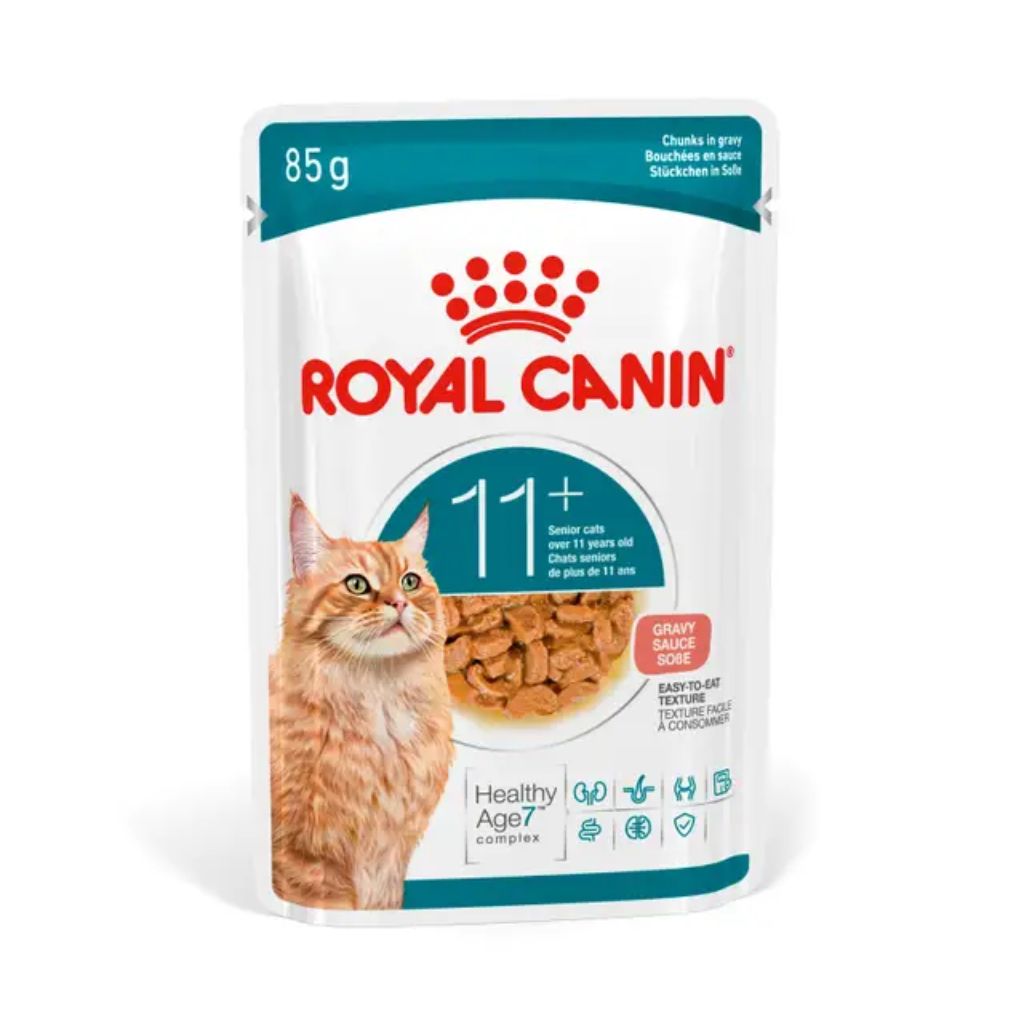 ROYAL CANIN® Ageing 11+ Chunks in Gravy is a wet food diet suitable for cats aged 11 and above. Designed for—and tested with—senior cats, ROYAL CANIN® Ageing 11+ Chunks in Gravy features an easy-to-eat texture to give your cat an enjoyable mealtime experience. This formula, featuring our HealthyAge7™ Complex, provides a precise nutritional blend designed to help maintain seven key dimensions of health and vitality in senior cats: Appetite and weight: Highly palatable and energy-rich to support a healthy appetite and help maintain an ideal weight. Digestion: Contains prebiotic fibres and highly digestible proteins to support healthy digestion. Mobility: Features EPA & DHA and chondroitin to support joint health and mobility. Skin and coat: The inclusion of linoleic acid and zinc helps maintain skin and coat health. Kidneys: Contains high-quality protein and adapted phosphorus levels to support kidney health. Brain and vision: Includes tryptophan, EPA & DHA, taurine, and vitamin A to support cognitive function and vision. Immunity: Contains vitamins C & E, lutein, taurine, beta-carotene, and lycopene to help support the immune system.
