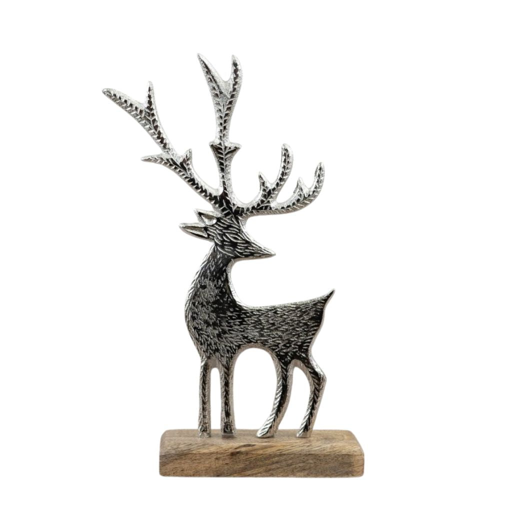 Add a touch of charm to your Christmas collection with this delightful aluminium reindeer perched atop a wooden base.