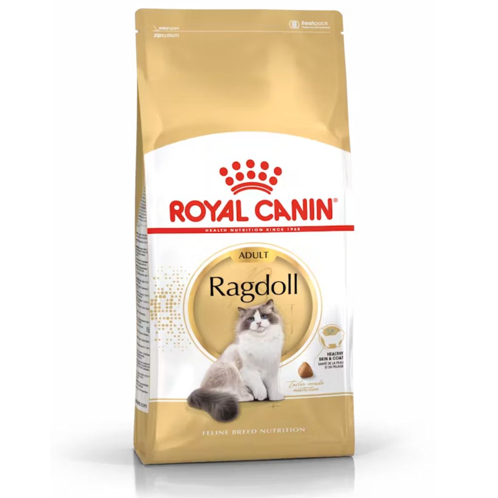 The Ragdoll is a remarkably stunning cat with captivating eyes and a soft, silky coat. The Ragdoll breed is large and loving with an affectionate and sociable nature; an absolute joy to be around. Royal Canin Ragdoll Adult food will help to maintain your cat's healthy skin and a well-nourished coat through a combination of specific nutrients; including amino acids, vitamins, and both omega-3 and omega-6 fatty acids.Royal Canin Ragdoll Adult food contains a concentrated amount of taurine to help support healthy cardiac function for your cat.The Ragdoll's large frame and heavy bones can be physically demanding, which is why ROYAL CANIN® Ragdoll Adult is designed with an enrichment of EPA and DHA (found in fish oil) to help support strong bones and healthy joints. The Royal Canin Ragdoll Adult kibble is meticulously crafted to adapt to the Ragdoll cat's broad jaw, allowing it to be easily grasped to encourage chewing and support oral hygiene.