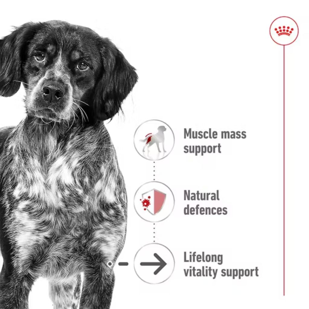 ROYAL CANIN® Medium Ageing Loaf is a nutritionally complete and balanced wet food diet specially designed to meet your medium-sized dog’s particular needs and support them throughout their senior years. This diet is suitable for medium-sized dogs that weigh between 11 and 25kg and are over 7 years old. With its specialised, high-quality protein content, this food is crafted to help your ageing dog maintain muscle mass. Your senior dog’s active lifestyle can expose them to environmental elements that can weaken their immune system. This formula contains prebiotics and a blend of vitamins, including vitamins C and E, to help support their natural defences. This specially crafted formula is enriched with essential vitamins and nutrients like EPA and DHA, to help support lifelong vitality and enjoy their senior years in good health. Enriched with a blend of nutrients, this food helps keep your senior dog’s skin healthy and their coat glossy and gorgeous.