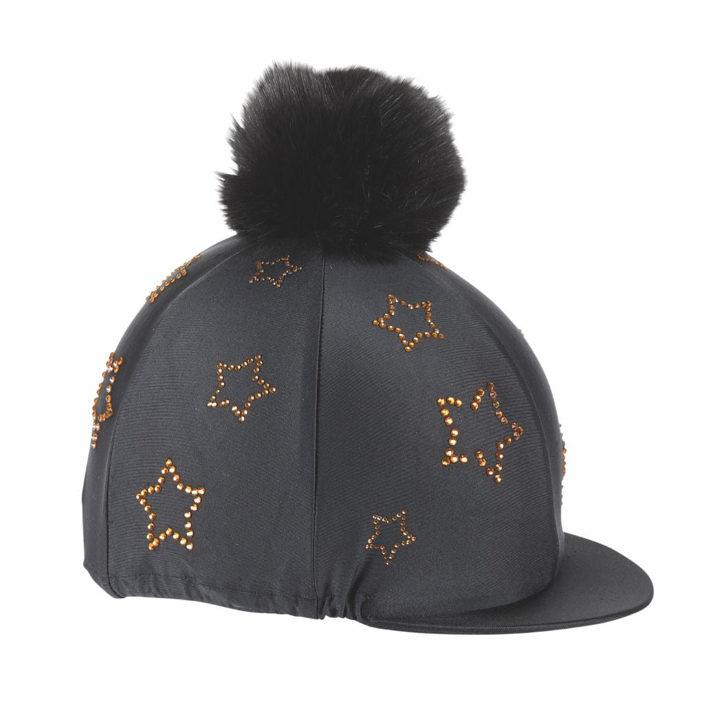 This diamante star hat cover from Shires has everything a girl wants, pretty sparkle diamante's to add a touch of glamour to your everyday riding, finished with a faux fur pom pom.