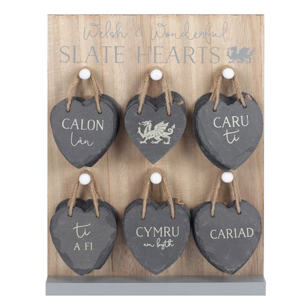A beautiful slate heart to celebrate the rich culture and national pride of Wales. Featuring the iconic symbol of Wales - the Welsh Dragon and brown string for easy hanging. Each heart design is unique as the slate is cut by hand. Perfect for decorating the home with traditional, Welsh charm.