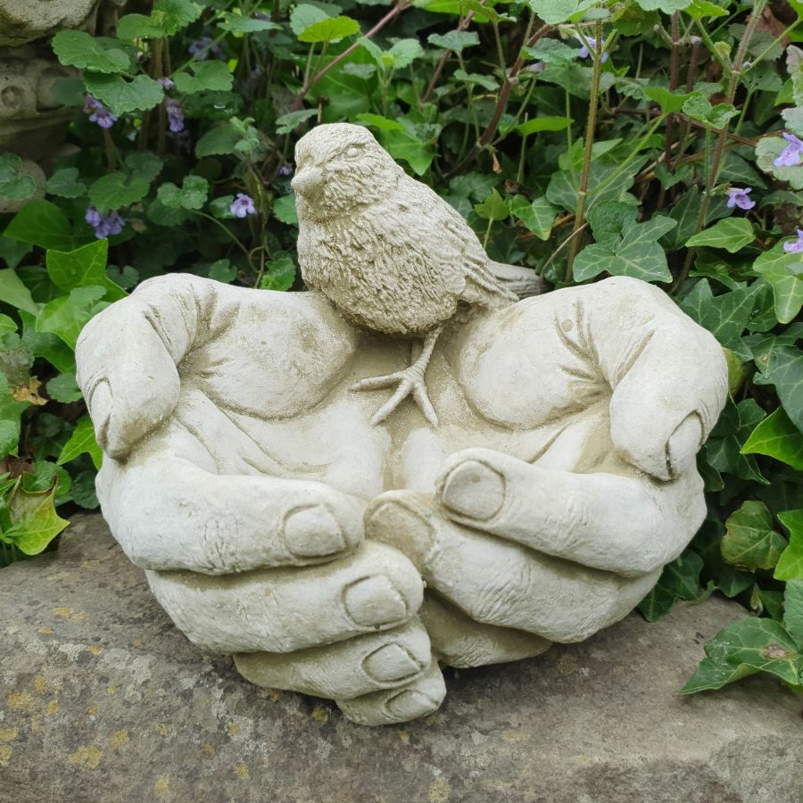 A garden stoneware birdfeeder in our signature antique patina.