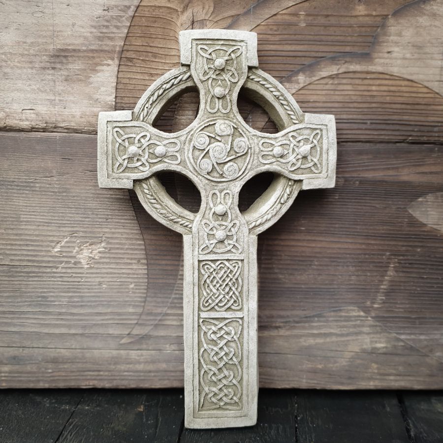 A hanging garden stoneware Celtic Cross Plaque in our signature antique patina.
