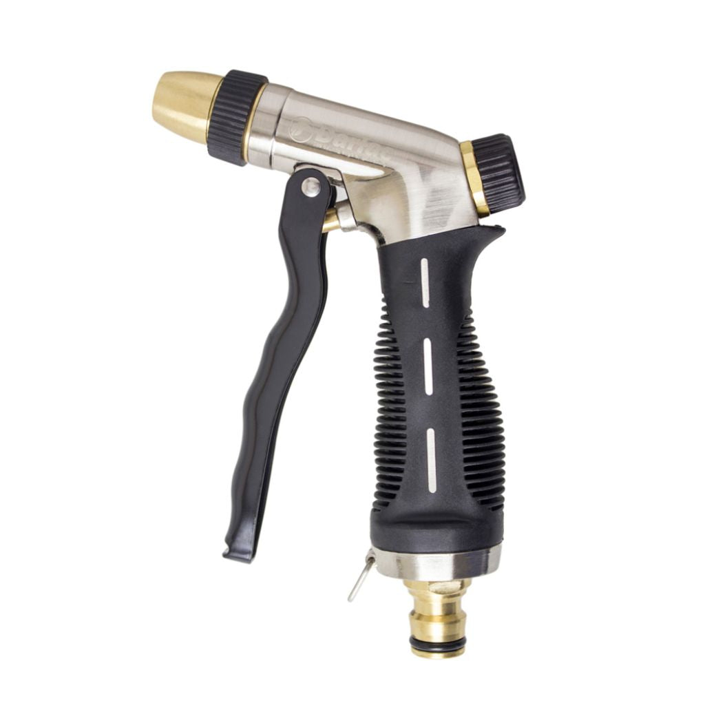 For sheer simplicity, the Darlac Deluxe Spray Gun is hard to beat. Constructed from brass and alloys that are corrosion resistant, with a soft grip and flow control for ultimate control. Rotate the nozzle of this durable yet lightweight garden spray gun to alter the output from a fierce jet to a fine mist spray to suit whatever the job requires. The easy to pull and hold trigger is ideal for gardeners with a weaker grip, and will easily lock on for long term usage without causing hand strain. The handy volume control knob on the back is great for using just the right amount of water, especially where soil may be washed away from plants or damage to flowers may occur.