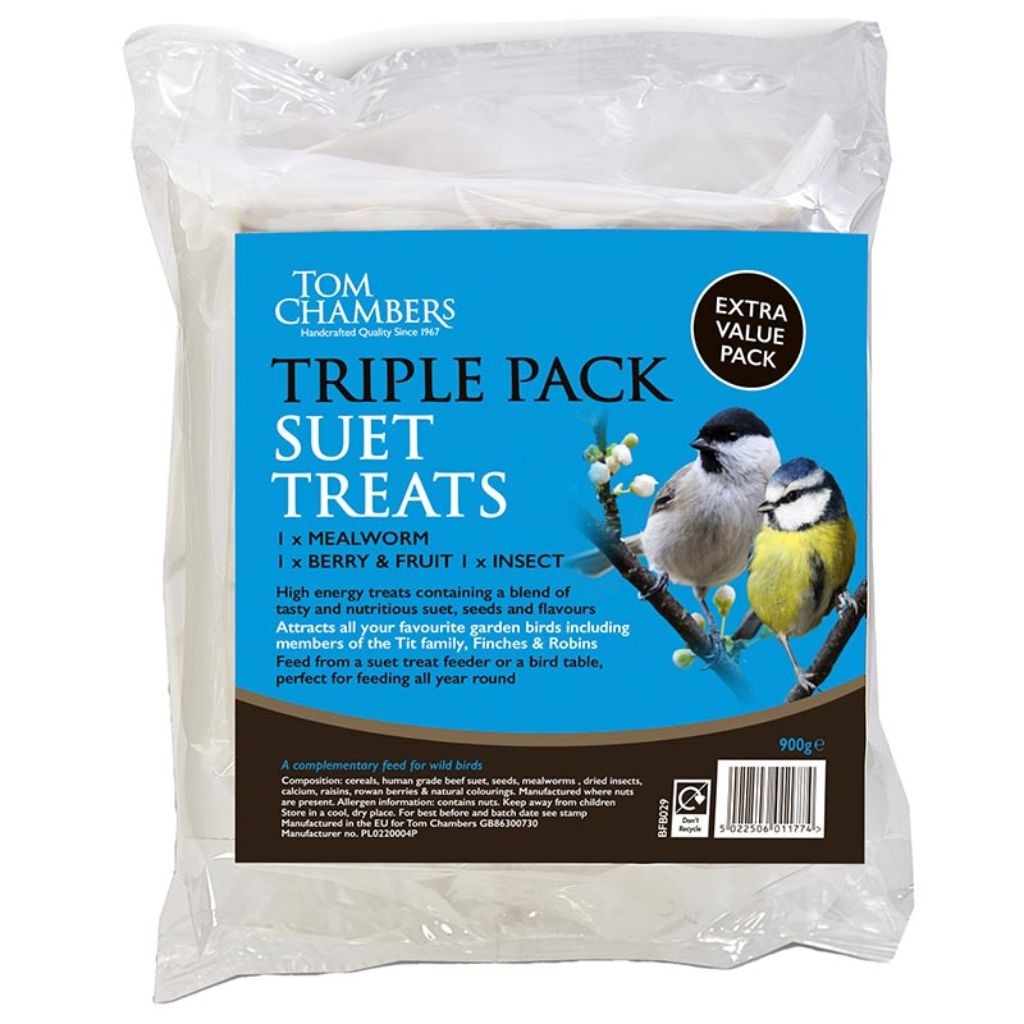This extra value pack of three Tom Chambers suet treats contains, one Berry & Fruit treat, one Mealworm and one insect suet treat. This selection of wild bird food is highly nutritious and tasty. Each suet treat is packed with protein rich ingredients and high in fat to help support wild birds with their energy levels and essential nutrients for overall health and wellbeing.