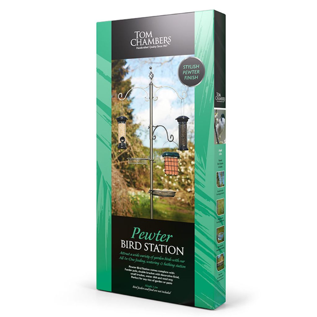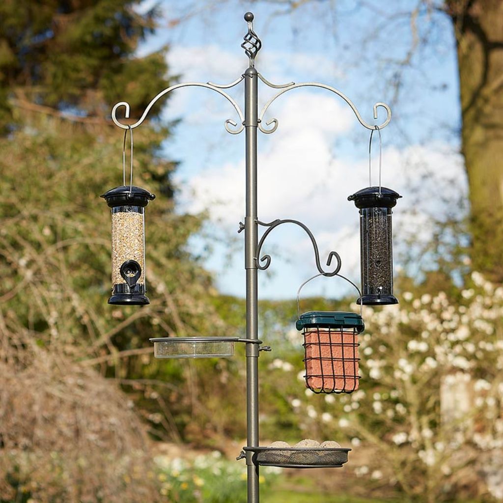 The Tom Chambers Pewter Classic Feeding Station is a handcrafted all-weather bird feeding station with multiple brackets for hanging feeders.