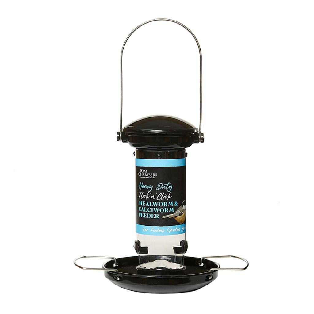 The Tom Chambers Heavy Duty Flick ‘n’ Click Mealworm Feeder is a stylish bird manufactured from steel with a black finish, ensuring it can withstand the elements.
