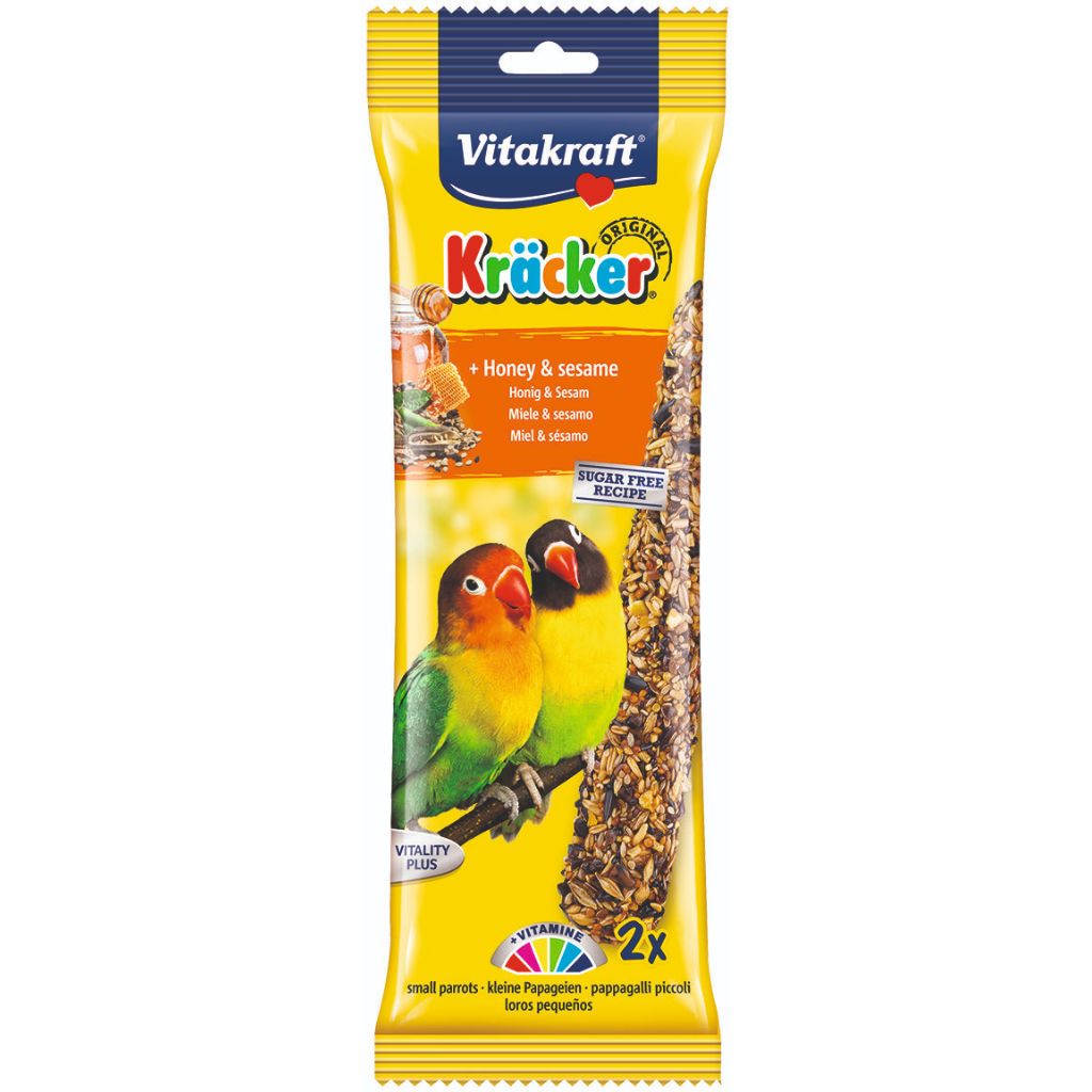 Vitakraft Krackers are designed to make your pet work for its treat. All krackers are baked three times on a natural wooden stick to ensure your parrot has plenty of nibbling satisfaction. Ideal for all small parrots including love birds Honey & Sesame Sugar free recipe Practical cage clip.